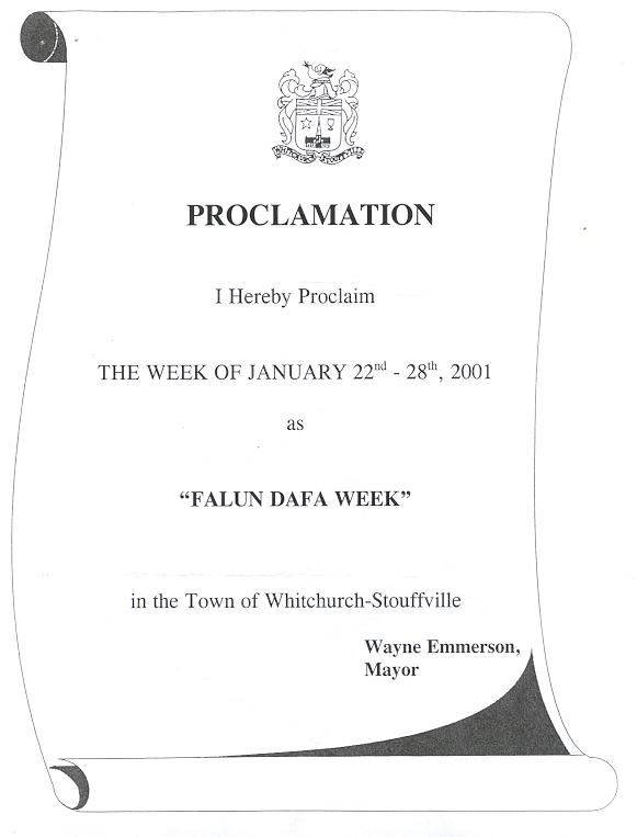 Proclamation of Falun Dafa Week in the Town of Whitchurch-Stouffville, Ontario, Canada