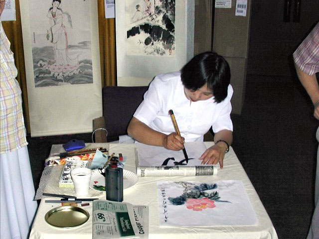 Ms. Zhang's painting demonstration enthralled visitors. She showed the traditional Chinese painting styles, and created calligraphy samples for the visitors. Painting almost non-stop during the show, Ms. Zhang took time out to meet visitors and sign booklets. Several visitors returned to the exhibit the second day to have a closer look. Many asked about Falun Dafa and the current situation in China. Local practitioners helped out, and clarified the truth to many visitors.