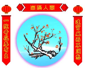 On the left: With a courtyard of gorgeous flowers, the spring has her master (The words on both left and right sides are from the Plum Blossom Poem, an ancient, well-known Chinese poem commonly thought of as a prophecy.)
