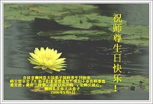 Master, please accept our most sincere good wishes on your 55th Birthday and the 14th anniversary of the introduction of Falun Dafa! We hope you will smile! We will do the three things well and save more sentient beings along with Master. Happy Birthday!