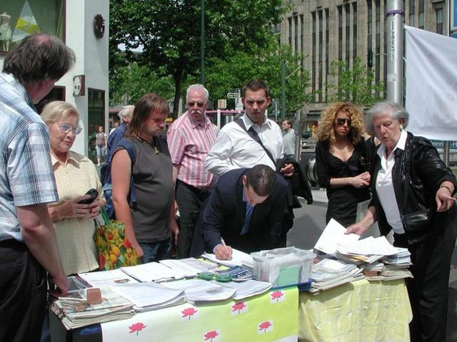 Local people expressed support for the activity, and many signed the petition condemning the CCP's persecution of Falun Gong one after another. They also expressed their concern about recent news of the Eutalstat Company halting satellite broadcasts of New Tang Dynasty TV programs into China. The company claimed it was a technical error, when in fact it was in response to threats and bribes by the CCP. Many people expressed their hope that New Tang Dynasty TV would again be able to broadcast into China as soon as possible. People felt that the Eutalstat Company should not give up their conscience and dignity.