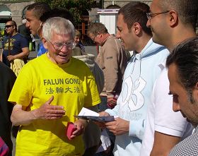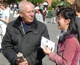 An old couple from Israel came to look at the pictures. They didn't understand why practitioners were at the square, so they asked a lot of questions. A practitioner told them that the CCP is a dictator in China, and it wants to control people's thoughts and doesn't allow people to have other beliefs. The couple then understood what the CCP is really like.
