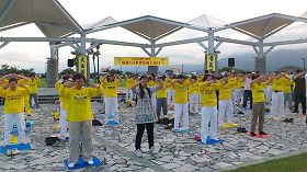 (Minghui.org) May 13, 2012 marked the 20th anniversary of Falun Dafa's public introduction and also the 61st birthday of the founder of Falun Dafa, Master Li Hongzhi. To celebrate this magnificent date, practitioners in Hualien, Taiwan did the Falun Gong exercises in a large group at the beautiful scenic spot, Seven Star Lake. They also held a series of activities to introduce Falun Gong to people and expose the persecution of Falun Gong in China.