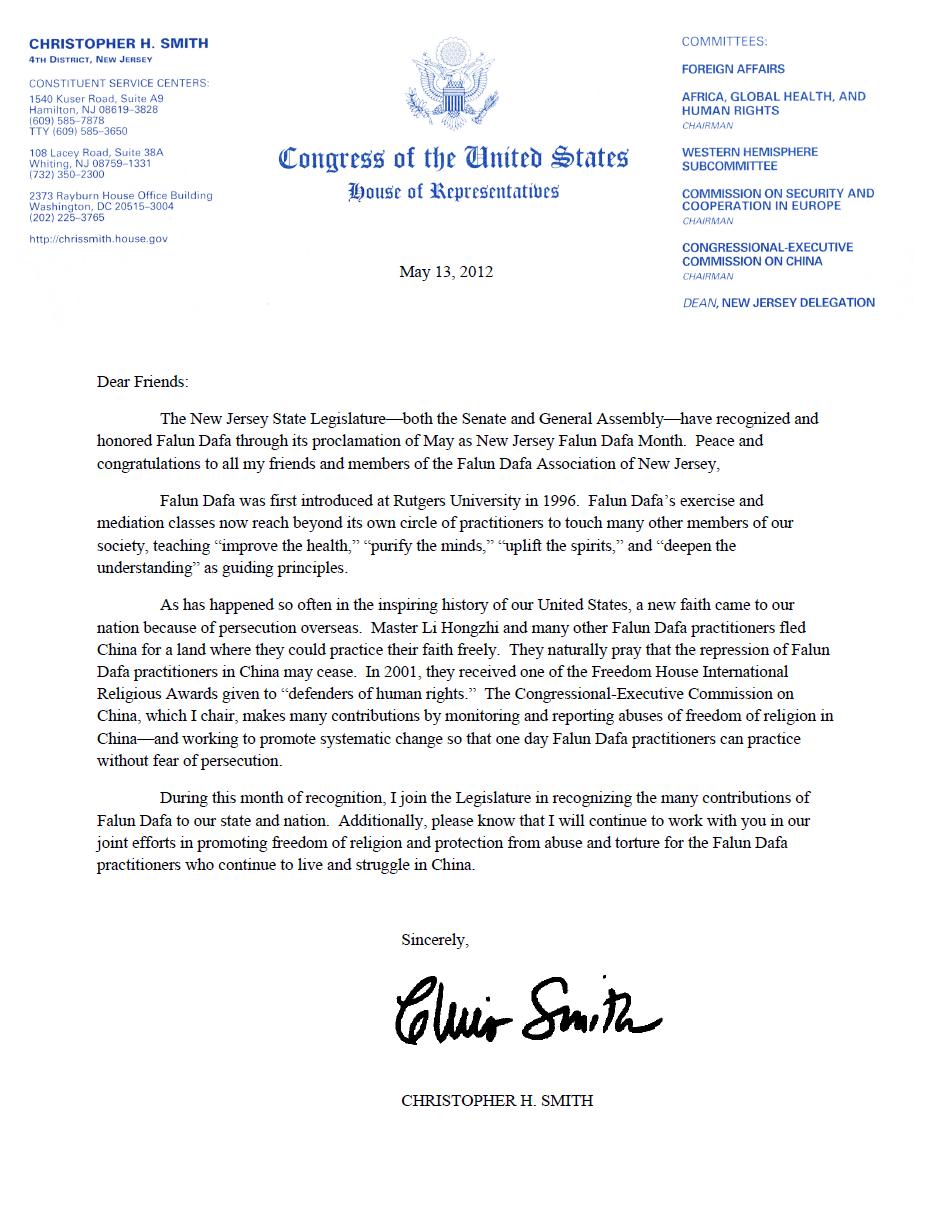 (Minghui.org) US Congressman Christopher Smith from New Jersey is an influencial member of the US Foreign Affairs Committee and the Chairman of Congressional-Executive Commission on China. On the occasion of the 13th World Falun Dafa Day and the 20th anniversary of the introduction of Falun Dafa to the public, Congressman Smith wrote the following letter to local Falun Dafa practitioners acknowledging Falun Dafa Day. He said in the letter: "During this month of recognition, I join the Legislature in recognizing the many contributions of Falun Dafa to our state and nation. Additionally, please know that I will continue to work with you in our joint effort in promoting freedom of religion and protection from abuse and torture for the Falun Dafa practitioners who continue to live and struggle in China."