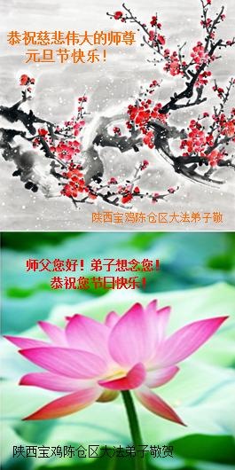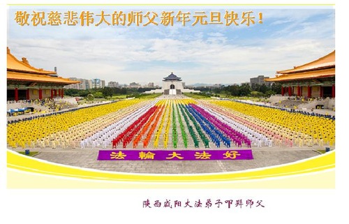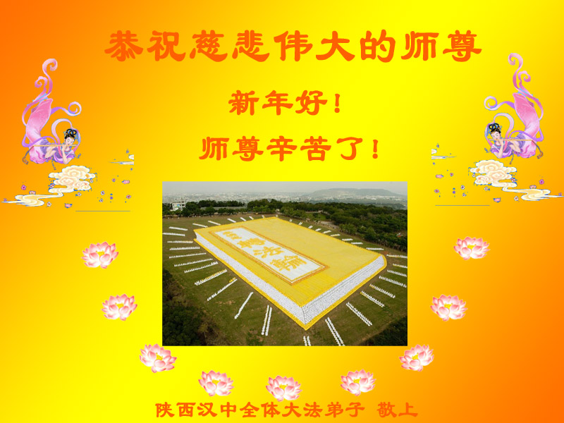 Below are some of the 30 greetings sent to revered Master from Falun Dafa practitioners in Xianyang City, Sanyuan County, Hanzhong City, Mian County, Tongchuan, Baoji City, Chenggu County, Qian County, Yulin, Liquan, Yan'an City, Qishan County, and Fufeng County in Shaanxi Province, China: