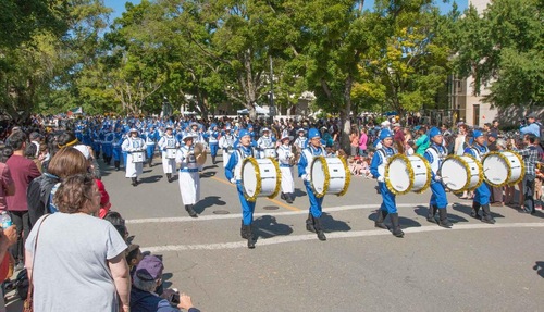 (Minghui.org) Falun Gong practitioners who were part of the Divine Land Marching Band participated for the fourth time in the 102nd Picnic Day Parade held on the campus of University of California, Davis, on April 16, 2016.