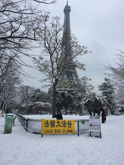 Falun Dafa Practitioners Working at Truth-Clarification Spot at the Eiffel Tower, Paris, France Respectfully Wish Revered Master a Happy Chinese New Year!