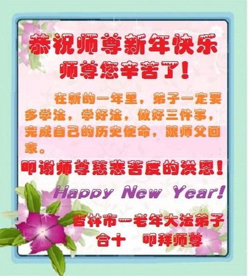 (Minghui.org) With the arrival of the 2018 Chinese New Year, Falun Dafa practitioners all across China are sending in their heartfelt greetings to wish revered Master Li Hongzhi a happy New Year. Below are greetings from some elderly practitioners, the oldest being 95.