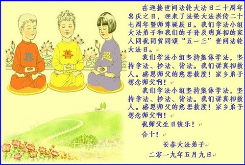 (Minghui.org) “We've understood the facts about Falun Dafa, it is great! It's the pure-land in this degenerating world! With tremendous reverence, we long for the day that we can welcome Master Li back to China. With his teachings, the morality of the Chinese people will rise again!” wrote one supporter of Falun Dafa in his greeting to celebrate the 20th World Falun Dafa Day, which is also the 27th anniversary of the practice's public introduction.