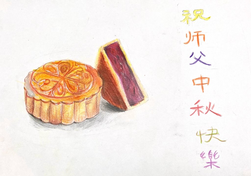 Greetings to Master from an eight-year-old practitioner with his drawing of moon cakes