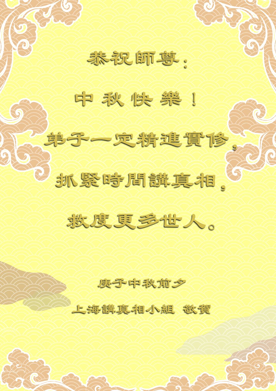 On the occasion of the Mid-Autumn Festival, which fell on October 1, practitioners engaged in various truth-clarification projects sent in their heartfelt wishes to Master Li Hongzhi, the founder of Falun Dafa, for a happy holiday.