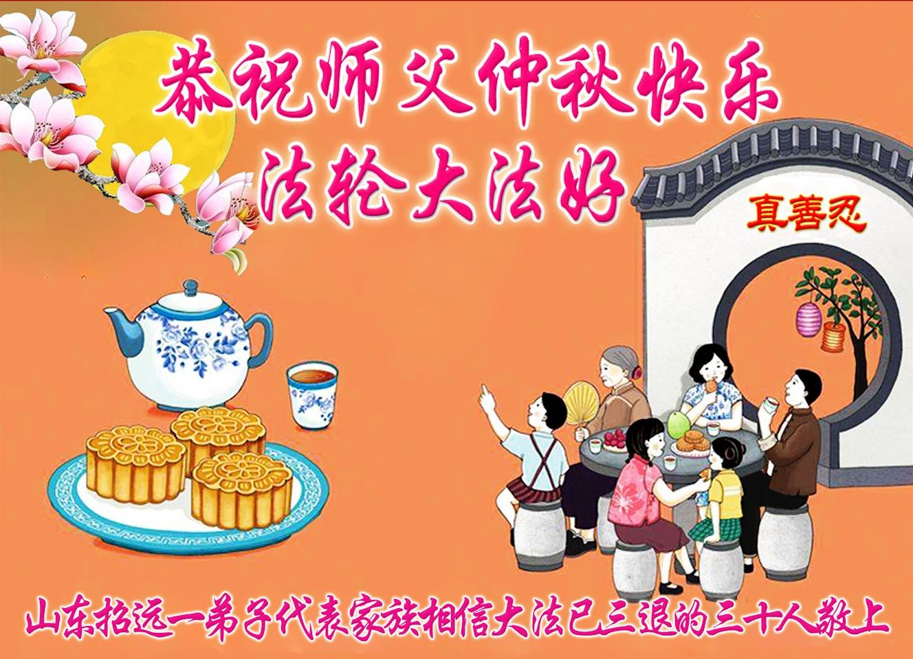 The family members of a few Falun Dafa practitioners in Zhucheng City, Shandong Province wrote, “Time flies! Now it’s another Mid-Autumn Festival! In the past twenty-some years, Master Li has given your disciples so much and helped them to assimilate to the universe’s principles, Truthfulness, Compassion and Forbearance, and become more compassionate and kind. Their hearts are purified and their levels improved. We are so happy about their progress. At this special occasion, please allow me to say ‘Thank you!’ on behalf of our family!”