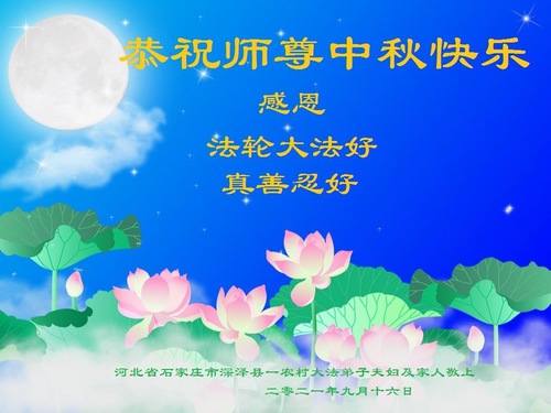 (Minghui.org) For the Mid-Autumn Festival, Falun Dafa practitioners who live in the countryside in China sent in their heartfelt greetings to Master Li Hongzhi, the founder of Falun Dafa, to wish him a happy holiday.