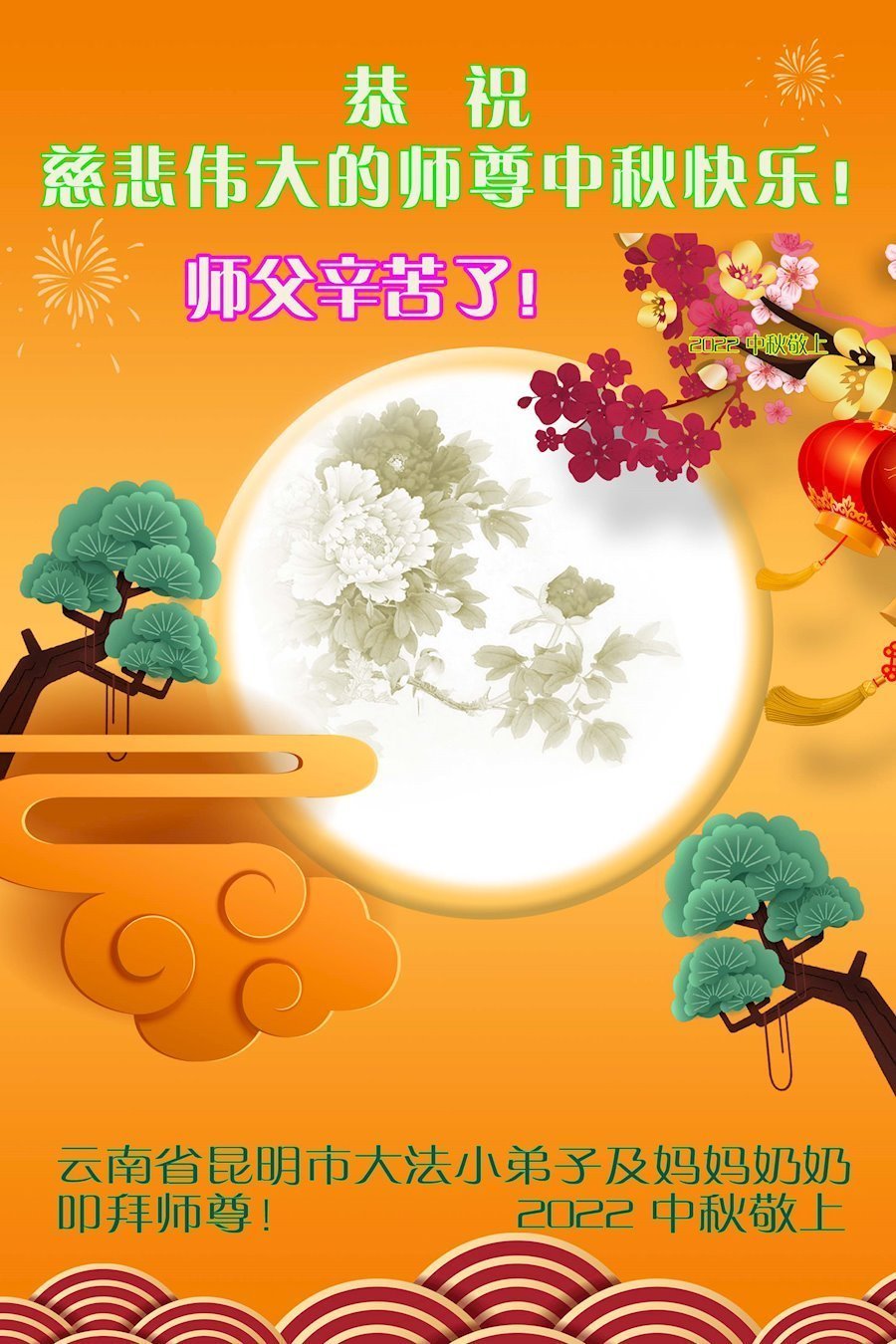 (Minghui.org) For the 2022 Mid-Autumn festival (September 10), many Falun Dafa practitioners are sending their heartfelt greetings to Master Li Hongzhi, the founder of the practice. They expressed their gratitude to Master Li for all the benefits they’ve received and vow to be more diligent in their daily cultivation.