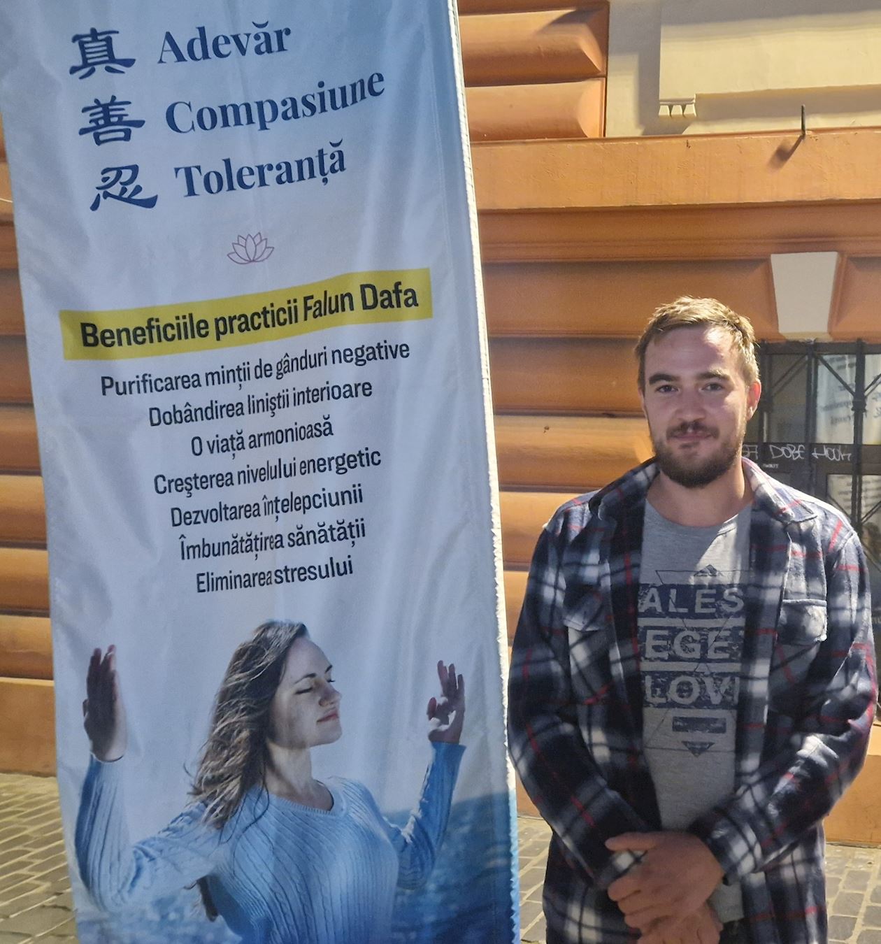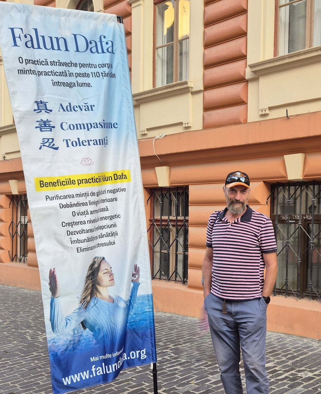 Dan Burlacu, a Romanian citizen, has lived in Toronto, Canada, since 1989, the year of the anti-communist revolution in Romania. While visiting his mother in Brașov, he stopped at the Falun Dafa booth. He said he was appalled by the persecution, especially the organ harvesting, and he praised Falun Dafa’s principles—Truthfulness, Compassion, and Forbearance—which he said are universal moral values.