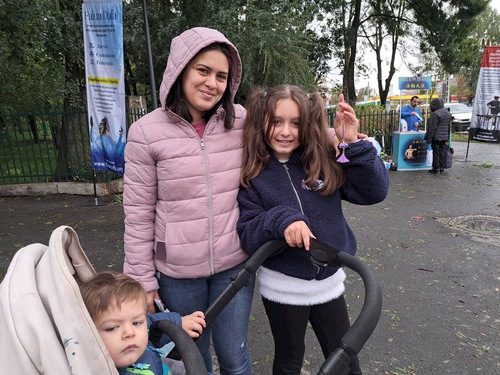 Clarisia, 35, was taking a walk with her two children. She said we need Dafa’s principles in everything we do. “We need kindness. People today are impatient. For example, they are impatient with children.” Sofia, her little girl, was very happy to receive a lotus flower and quietly listened when a practitioner explained the principles to her.