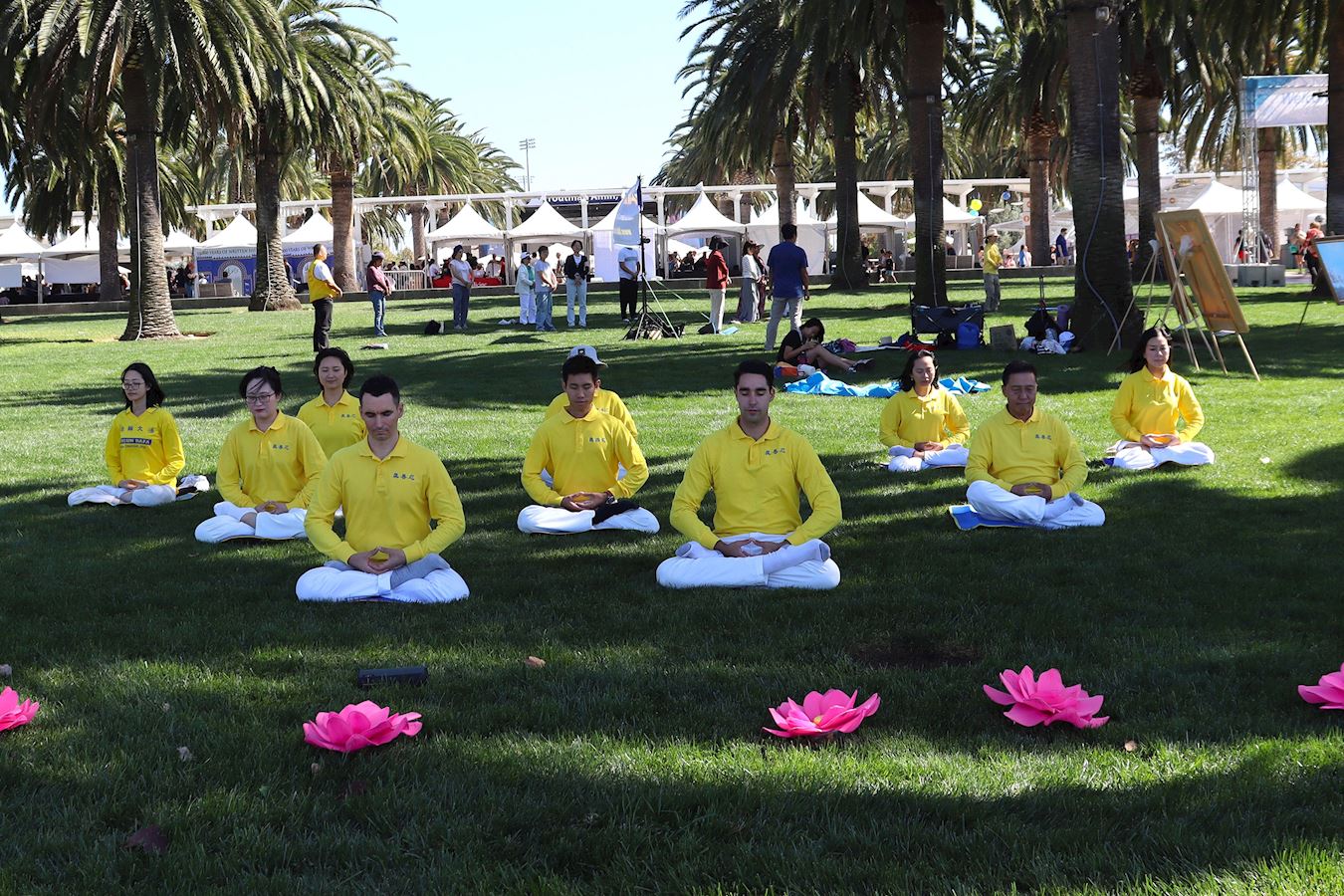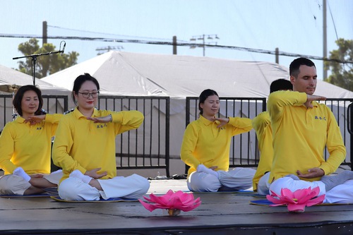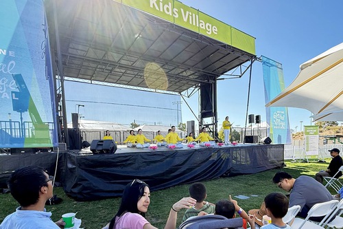 Falun Dafa practitioners demonstrated the five sets of exercises on the stage and on the lawn at the 24th Irvine Global Village Festival on October 11, 2025.