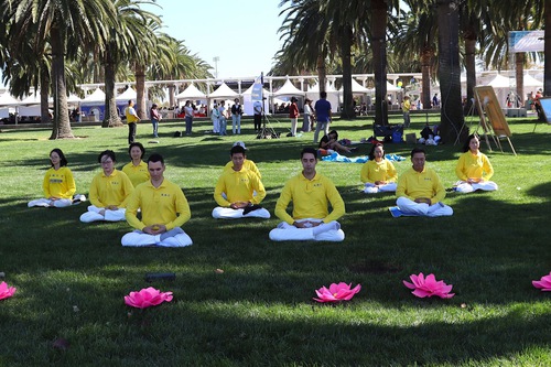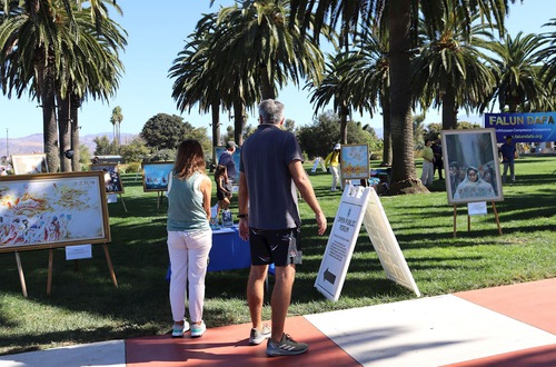 They demonstrated the five exercises of Falun Dafa and displayed art works from the Art of Zhen, Shan, Ren International Exhibition, so that visitors could learn more about the practice.