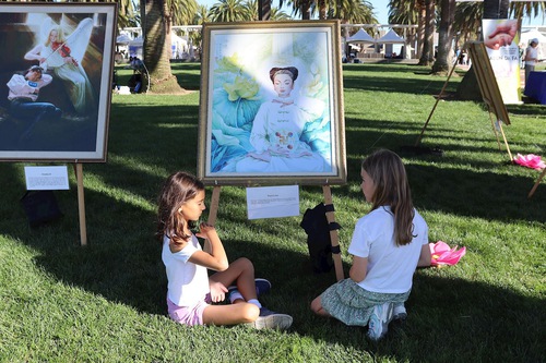 Practitioners displayed paintings from the Art of Zhen, Shan, Ren International Exhibition on the lawn. People stopped to admire them and asked questions. While two women were asking questions, the girls accompanying them went to look at the paintings, then sat down to imitate the meditation postures of the figures in the paintings. A young practitioner came over to teach them the movements, and they happily left with small lotus flowers as gifts.
