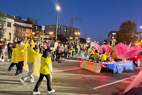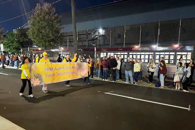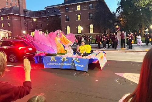 (Minghui.org) The Falun Gong Twin Cities Club participated in the University of Minnesota Homecoming Parade on October 10, 2025. Many spectators said they were impressed by the brightly colored float, costumes, and uplifting music.