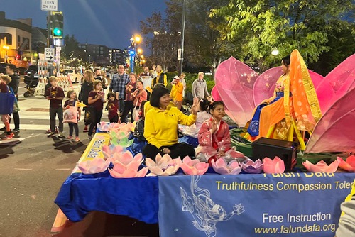 The parade started at 6:30 p.m., the Falun Gong Twin Cities Club members’ float was decorated with a large pink lotus flower and practitioners dressed in traditional Chinese costumes waved to spectators. Practitioners carried banners in front of, and behind the float, and practitioners distributed lotus flowers along the parade route.