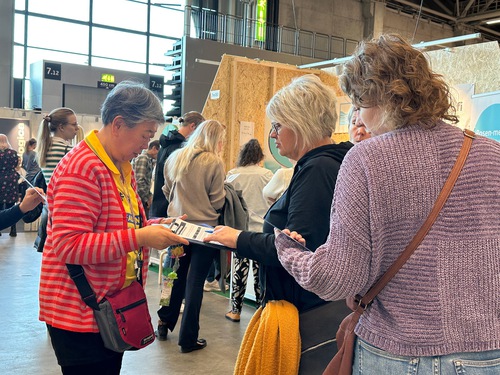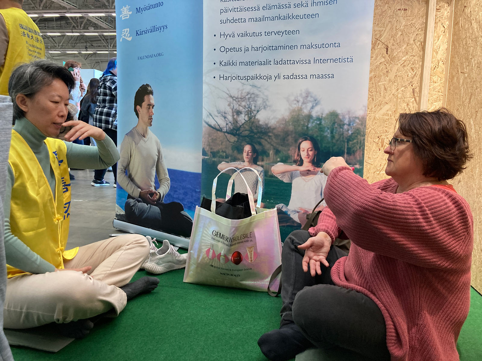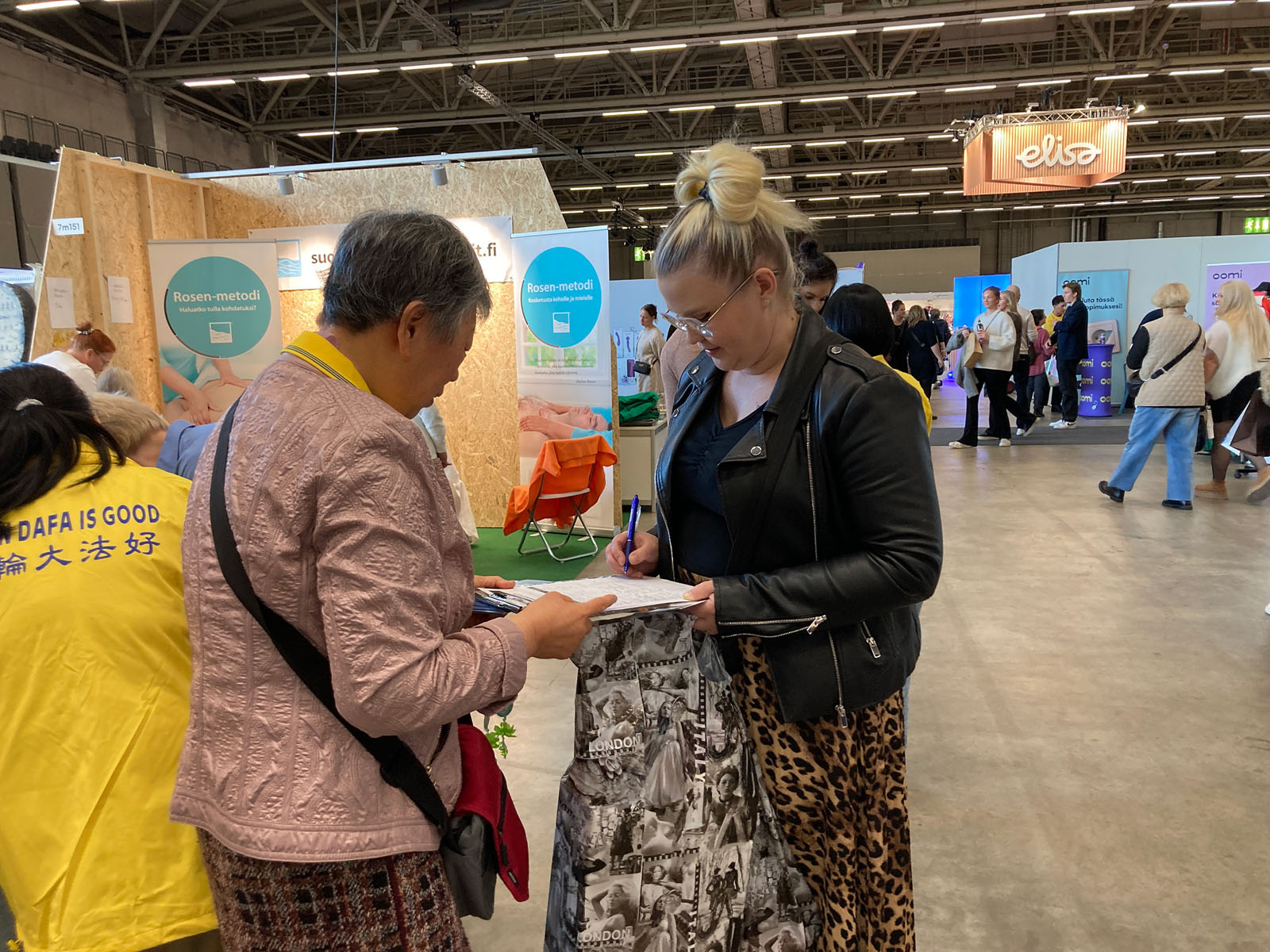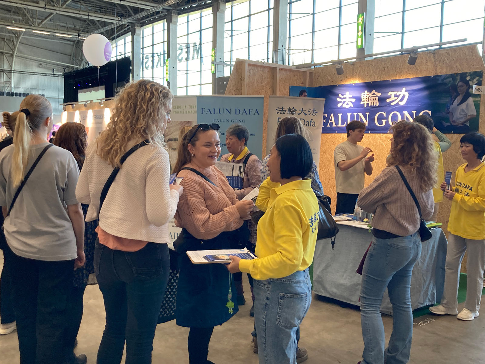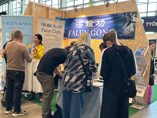 (Minghui.org) The 2025 “I Love Me” health expo held at the Helsinki Exhibition and Convention Center in Finland October 17 to 19, 2025, showcased the latest trends in beauty, fashion, and wellness. Falun Dafa practitioners, who were invited to participate, told people about the benefits of practicing Falun Dafa and how the Chinese Communist Party (CCP) persecutes the spiritual discipline. Many people stopped by their booth, and some learned the exercises at the event.