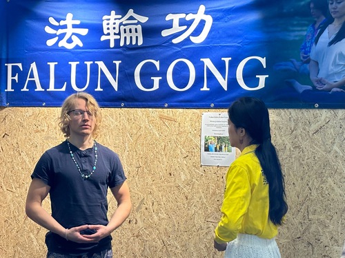 When Jaakko visited the Falun Dafa booth, he said Falun Dafa’s principles of Truthfulness, Compassion, and Forbearance were very good, and he wanted to learn the exercises. After doing them for an hour, he was pleasantly surprised at how good he felt. Although he’d never meditated before, he was able to sit for half an hour on his first try.