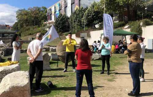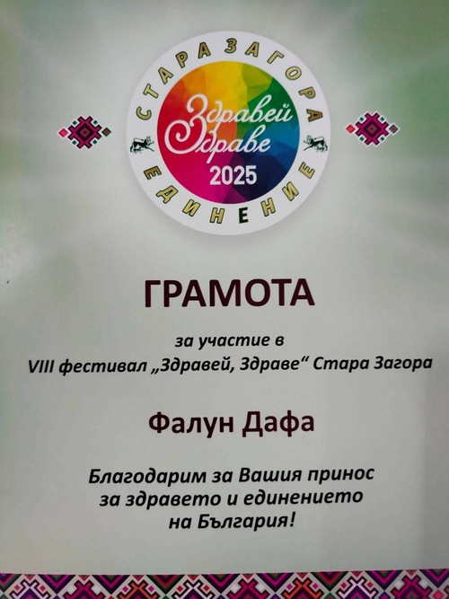 (Minghui.org) The eighth “Hello, Health!” festival was held in Stara Zagora, known as the City of Linden Trees and Poets, on October 11 and 12, 2025. Falun Dafa (also known as Falun Gong) practitioners from different parts of Bulgaria participated in the event to introduce their spiritual practice to the public. The organizers of the festival issued a certificate of participation to Falun Dafa to express gratitude for its contribution to the health and unity of Bulgaria.