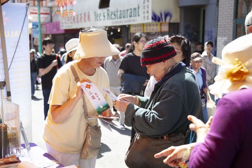 (Minghui.org) Falun Dafa practitioners participated in the Chinatown Autumn Moon Festival in San Francisco, held September 27-28, 2025. They introduced Falun Dafa (also known as Falun Gong) and raised awareness of the Chinese Communist Party’s (CCP) persecution. Many people signed the petition calling to stop the CCP’s state-sanctioned forced organ harvesting. Some people learned the Falun Dafa exercises during the event.