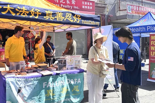 Practitioners talk with visitors about Falun Dafa and the CCP’s persecution in the Chinatown Autumn Moon Festival celebration on September 27 and 28, 2025.
