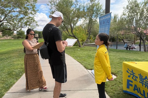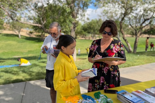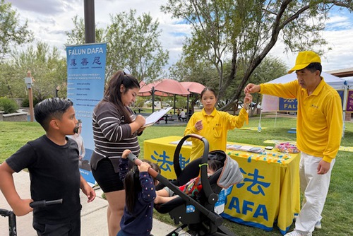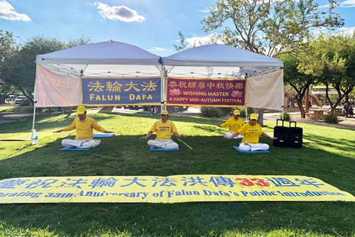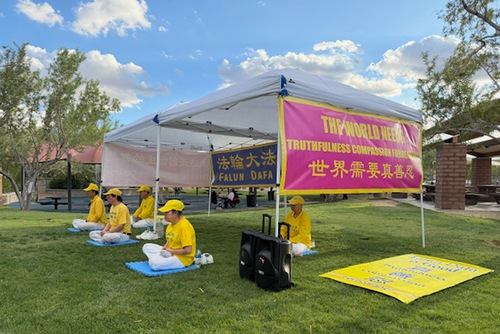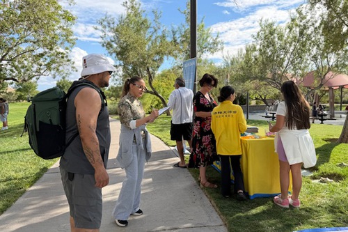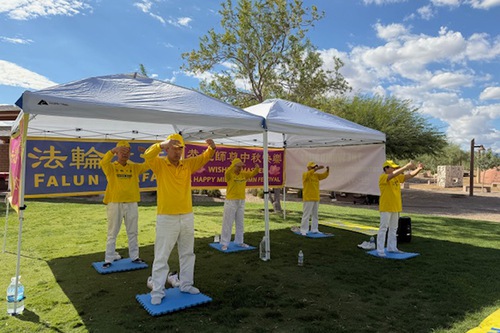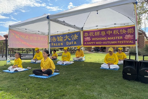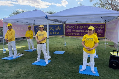 (Minghui.org) With the Mid-Autumn Festival around the corner, practitioners in Las Vegas gathered at Exploration Peak Park on September 28 to celebrate, introduce Falun Dafa (Falun Gong) to the local community, and thank Master Li (founder of the practice) for the benefits they received from the practice.