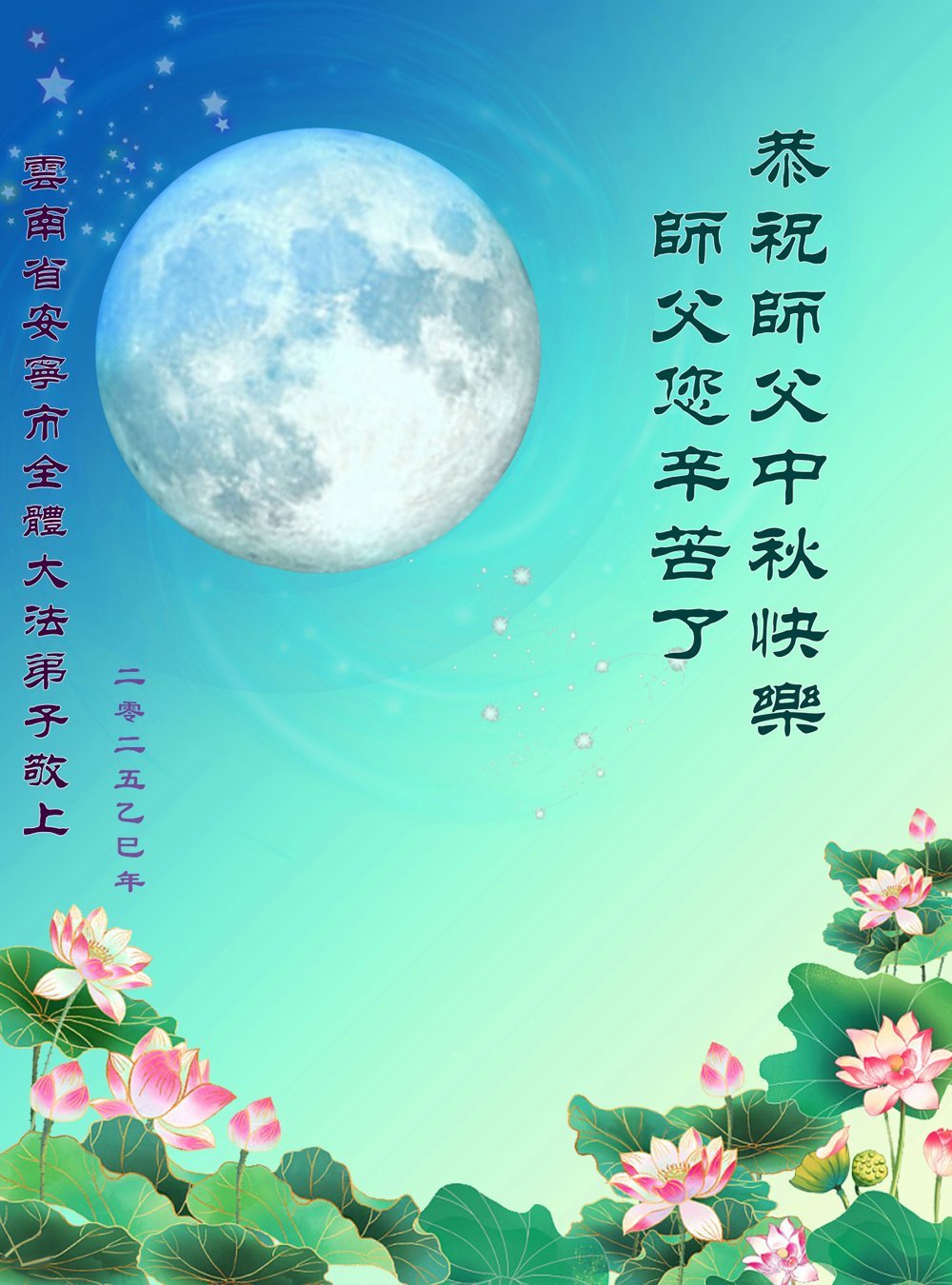 Falun Dafa Practitioners in Yunnan Province Respectfully Wish Master Li Hongzhi a Happy Mid-Autumn Festival (20 Greetings)