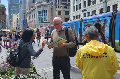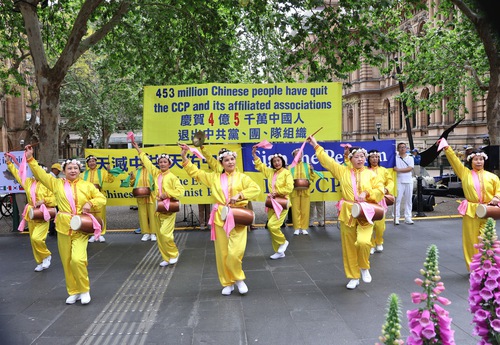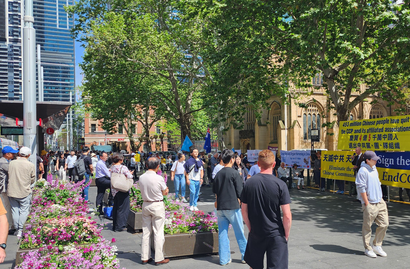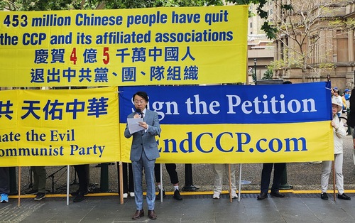 (Minghui.org) Falun Dafa practitioners held a rally in front of the Sydney Town Hall on September 28, 2025, to celebrate 450 million Chinese people quitting the Chinese Communist Party (CCP) and its affiliated youth organizations. Guests speakers commended the groundswell of withdrawals from the CCP, referring to those brave enough to withdraw from the CCP organizations as standing at the forefront of a future free China.
