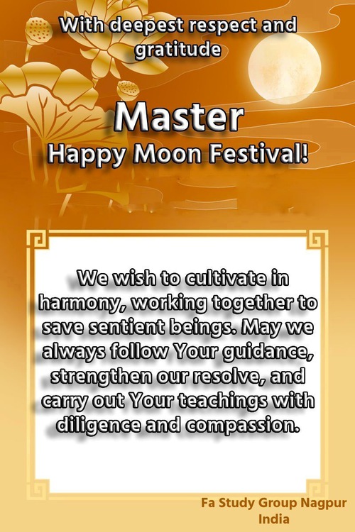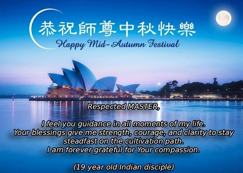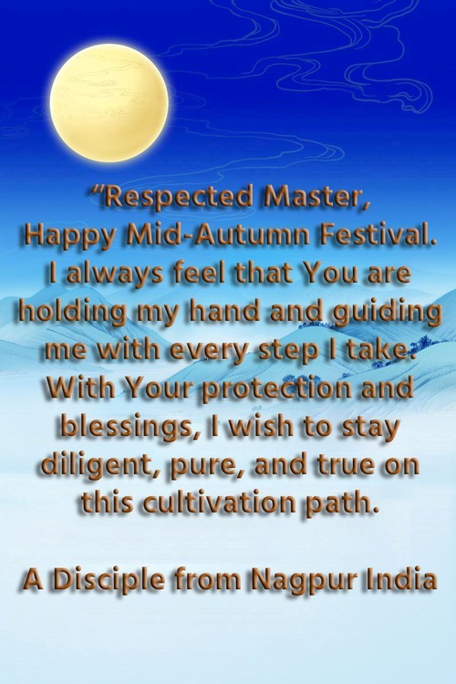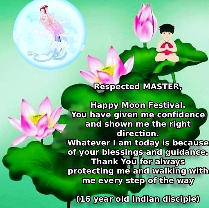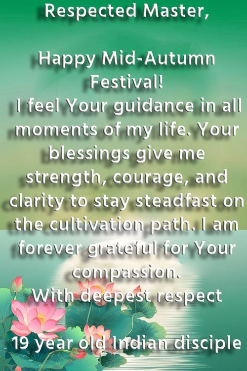 Respected Master,Happy Mid-Autumn Festival!I feel Your guidance in all moments of my life. Your blessings give me strength, courage, and clarity to stay steadfast on the cultivation path. I am forever grateful for Your compassion.With deepest respect