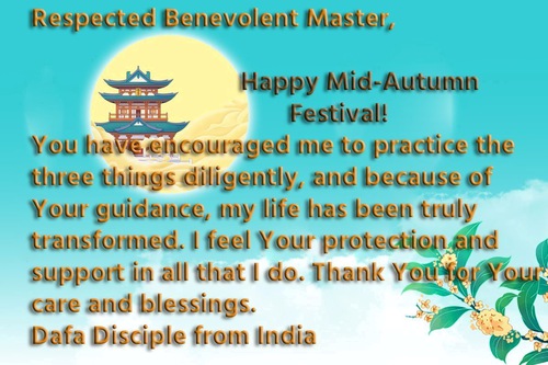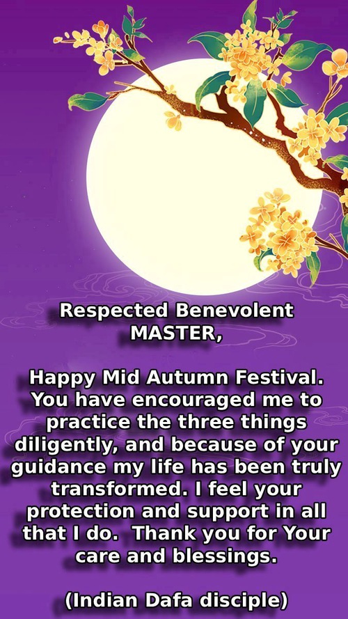 Respected Benevolent Master,Happy Mid-Autumn Festival!You have encouraged me to practice the three things diligently, and because of Your guidance, my life has been truly transformed. I feel Your protection and support in all that I do. Thank You for Your care and blessings.