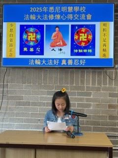 Aide, also a student in the senior class, shared his experience which was titled: “Growing Through Adversity.” He realized that setbacks in study or life are opportunities for growth, and reminders for him to study the Fa diligently and work on overcoming his shortcomings. He aspires to be more composed, get angry less often, and be more diligent in his practice, and strive to be a genuine Dafa practitioner.