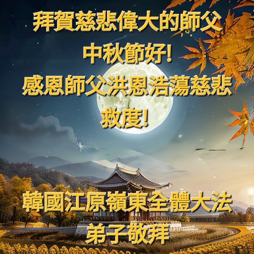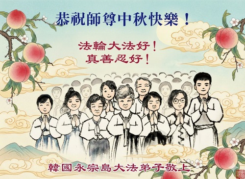 (Minghui.org) In this report, we present greetings from practitioners in Seoul, Jeju Island, Incheon, Yeongjong Island, Ansan, South Gyeongsang Province, Chungsejong City, Gimhae City, Siheung City, Goyang City, North Chungcheong Province, North Jeolla Province, Suwon, Gimhae City, Cheonan City, Bucheon, Daejeon City, Daegu City, Gwangju South Jeolla Province, North Gyeongsang Province, Gangwon Yeongdong, Changwon, Haman, Ulsan and other places in South Korea. They wish Master Li a happy Mid-Autumn Festival.
