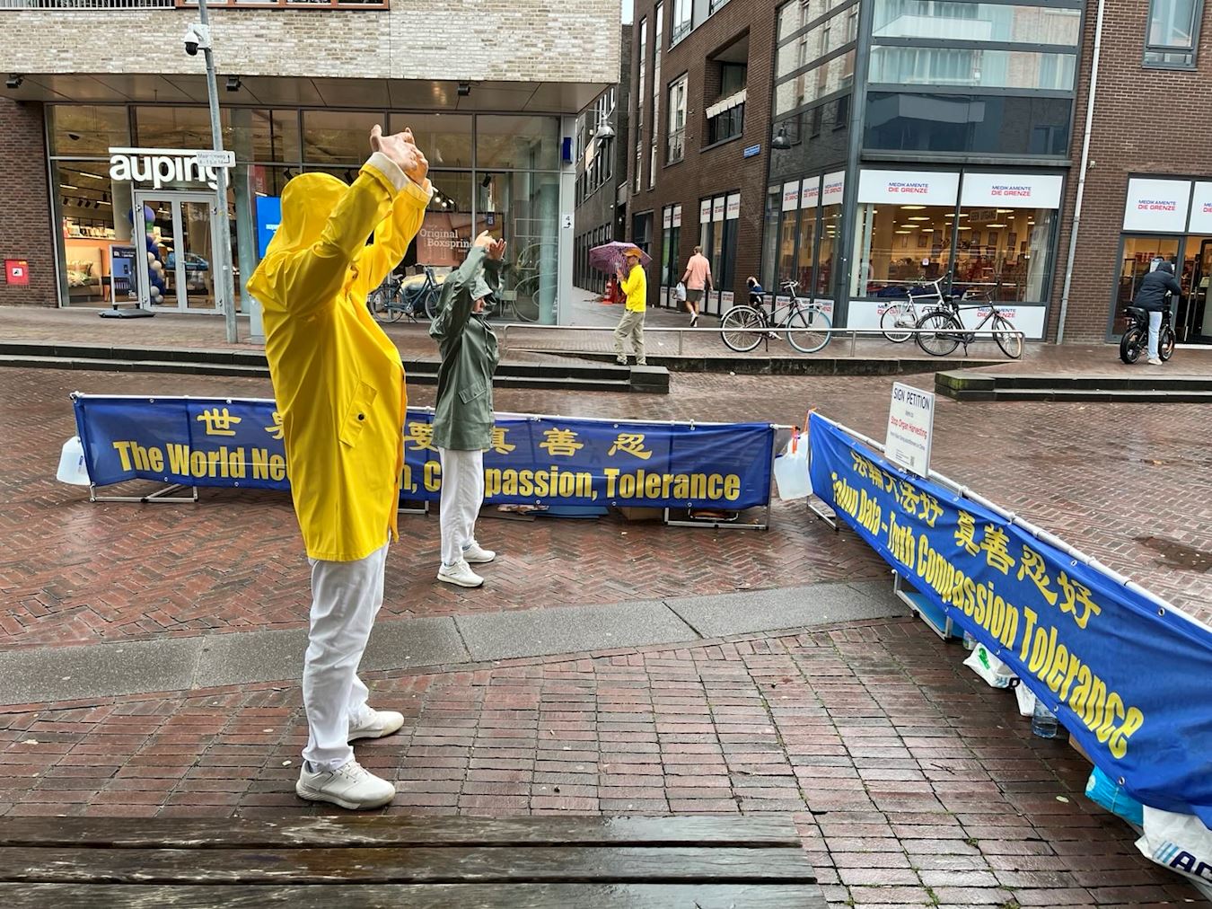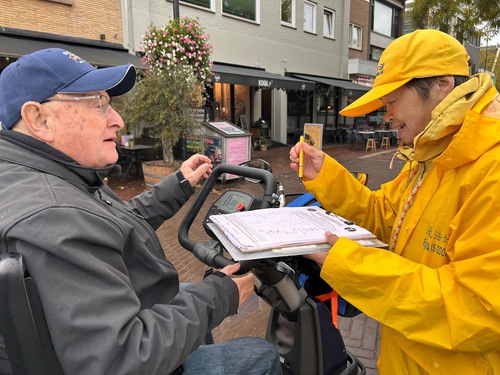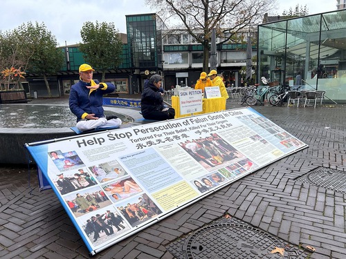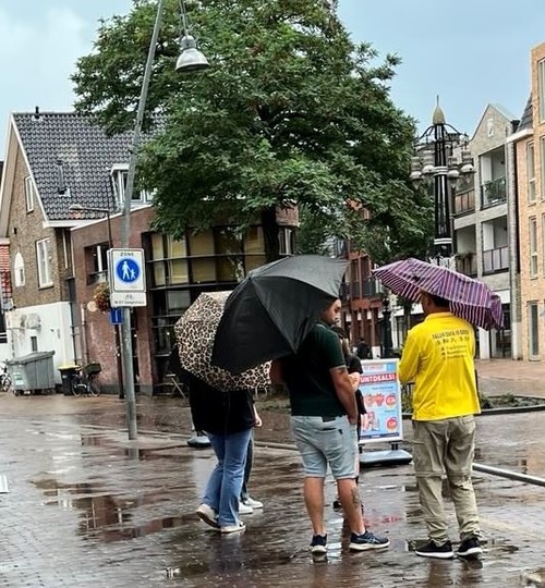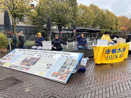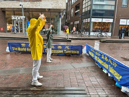 Practitioners set up displays and demonstrated the Falun Dafa exercises on Heuvel Street in Oss, a city in North Brabant Province, on October 25, 2025. Despite the rain, many people stopped to talk with practitioners and learned about Falun Dafa.