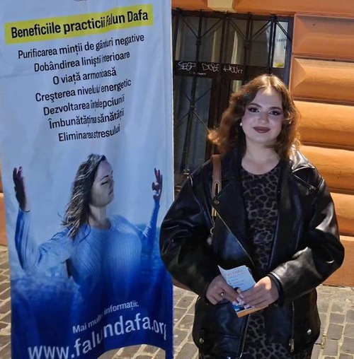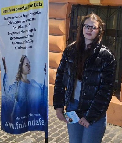 Irina Vatagu, a student at the Faculty of Letters in Brașov, said that the banner and music caught her attention, so she came to the stand. “The first time I heard this music, I wondered what was going on, because you don’t usually see this kind of thing in the city center. Then I started reading the banner and I think it’s a pretty good cause so I signed the petition,” she said. Vatagu sees the values of Falun Dafa as a remedy for a balanced society that benefits its members.