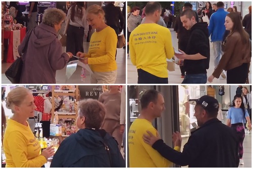 Practitioners talked to interested people about the principles of Truthfulness, Compassion, and Forbearance, as well as the fact that in China, under the Chinese communist regime, Falun Dafa practitioners are persecuted for their belief. Some people said they had heard about Falun Dafa on the Internet.