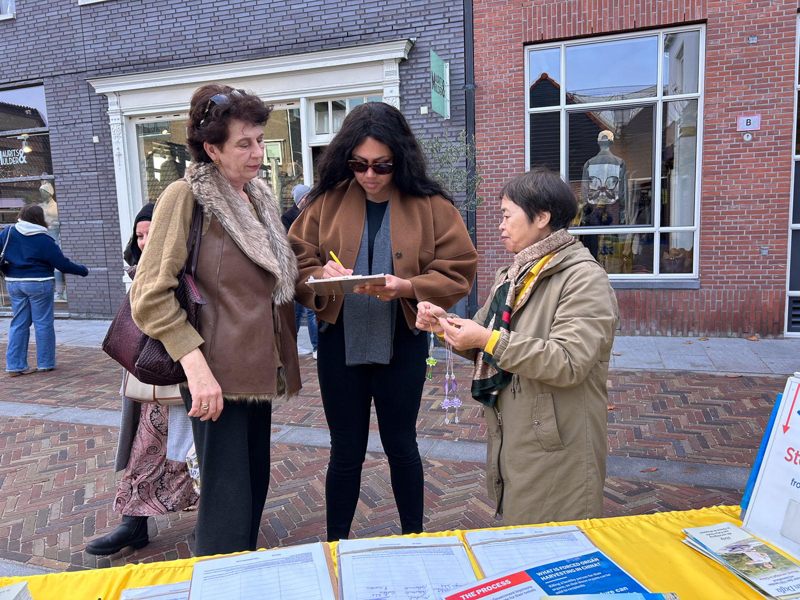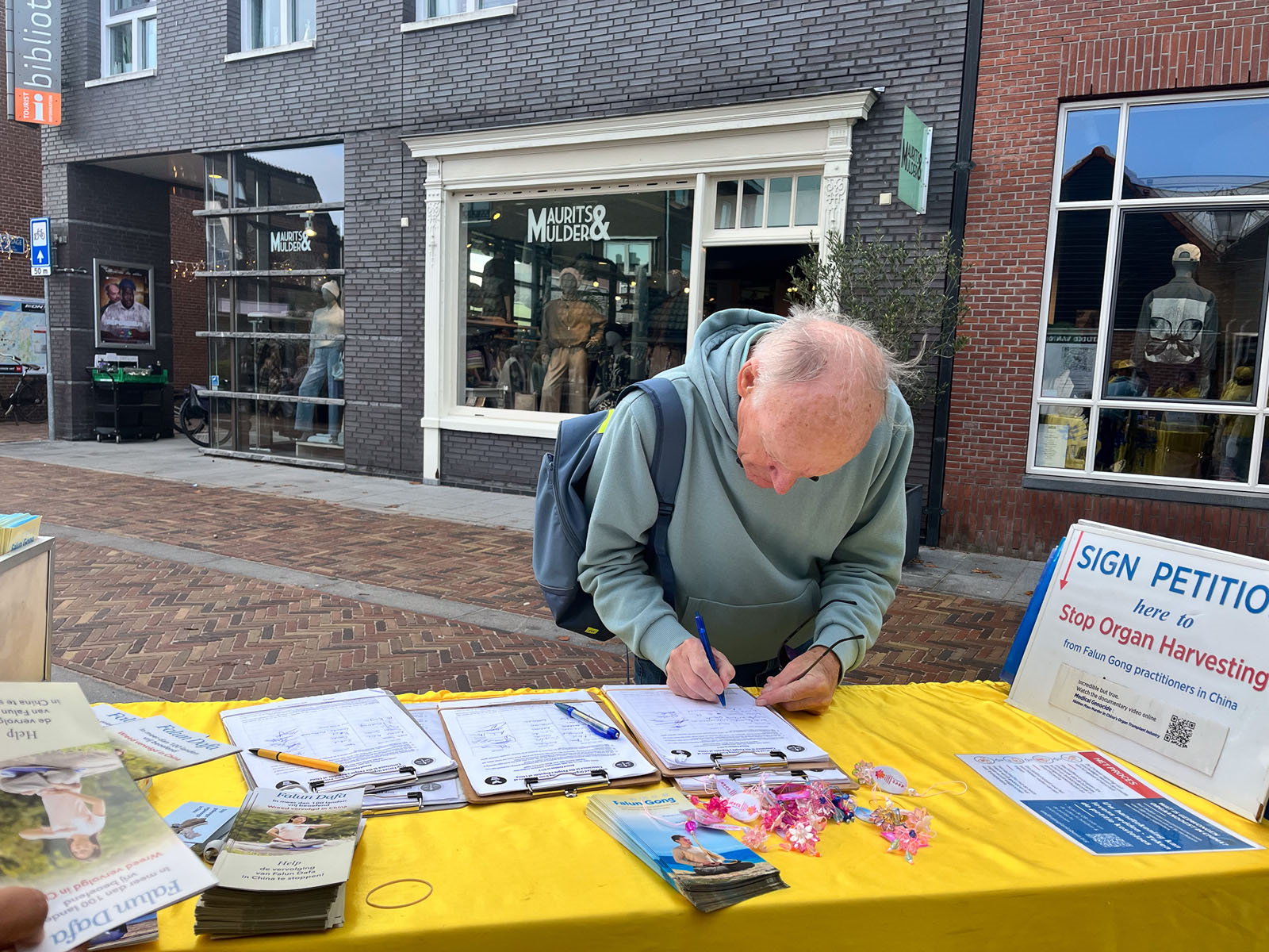 Falun Dafa practitioners set up their booth on Langstraat around noon, and a photographer from De Wassenaarse Krant took pictures of their exercise demonstration. Local residents who heard about the activities came to sign a petition in support of Falun Dafa.
