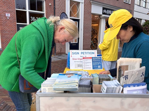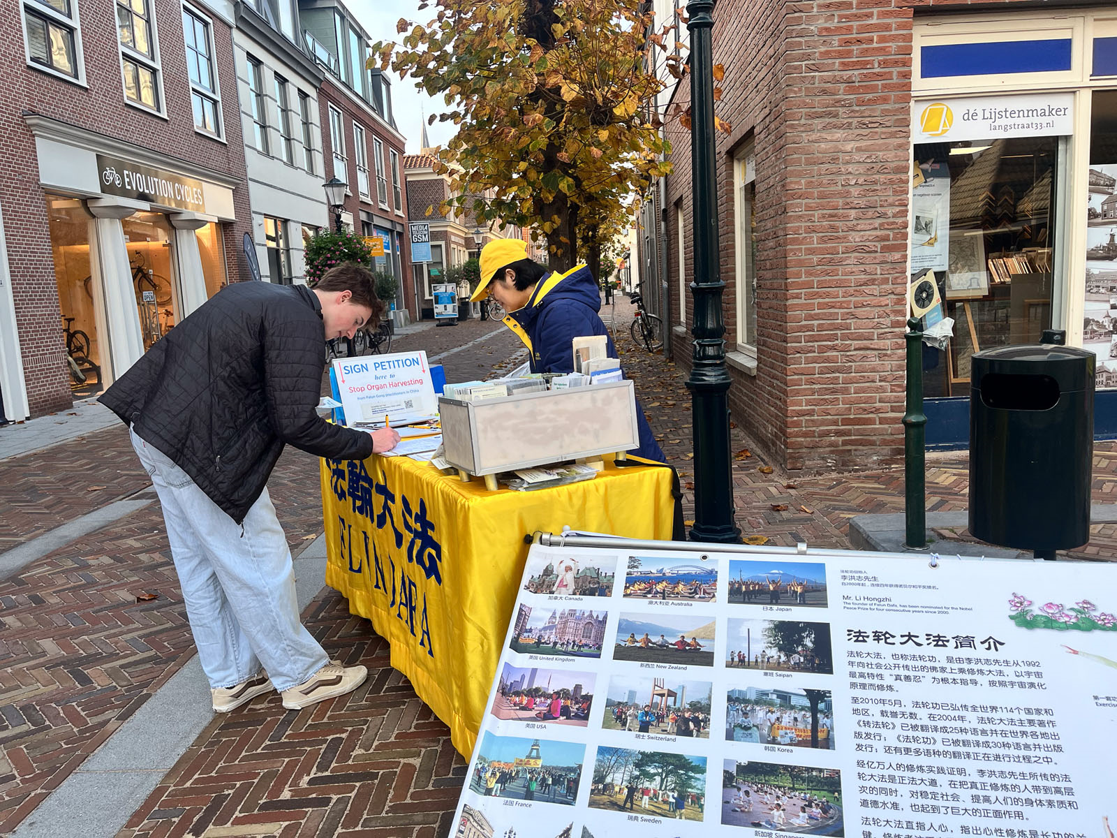 A man from Portugal happened to be visiting his friend in Wassenaar. He told practitioners in fluent Chinese that he taught Modern Chinese history and knew about the persecution of Falun Dafa in China. He took a copy of the Nine Commentaries on the Communist Party and other brochures in Chinese.