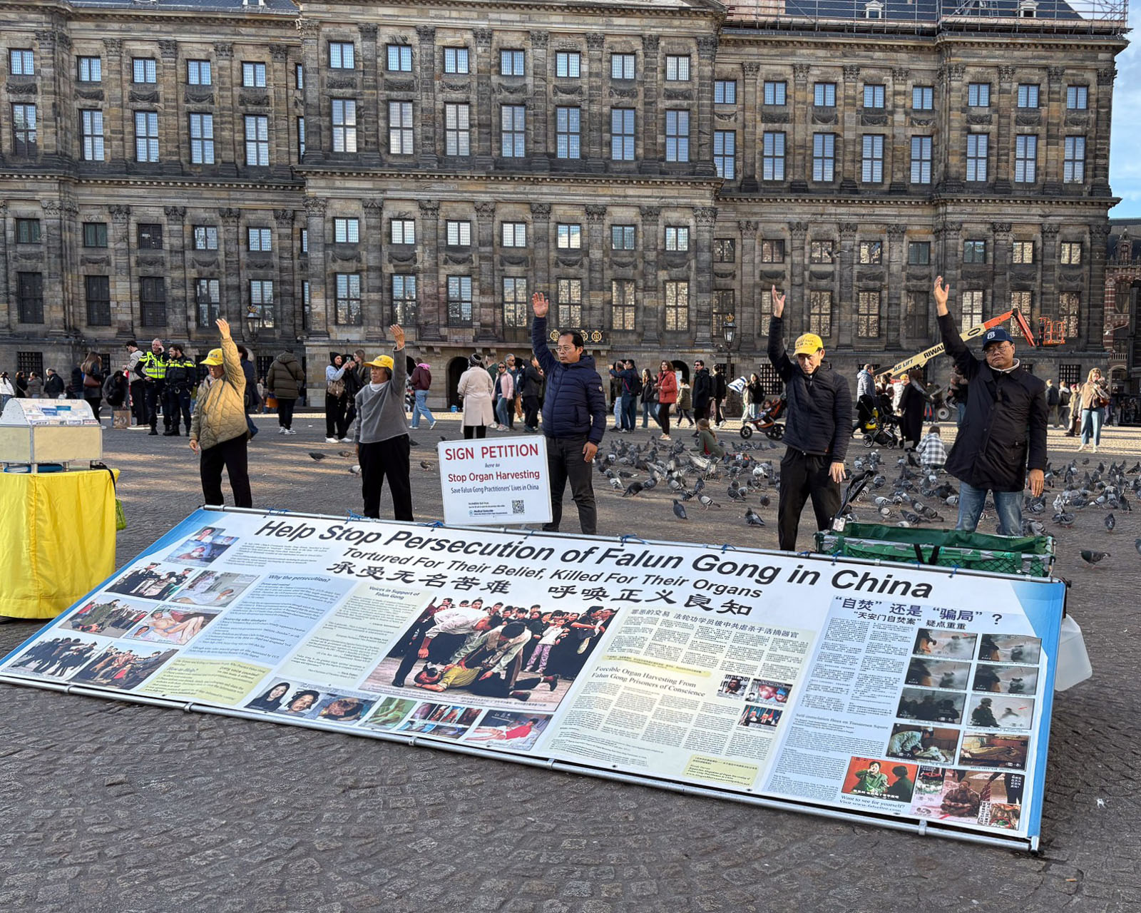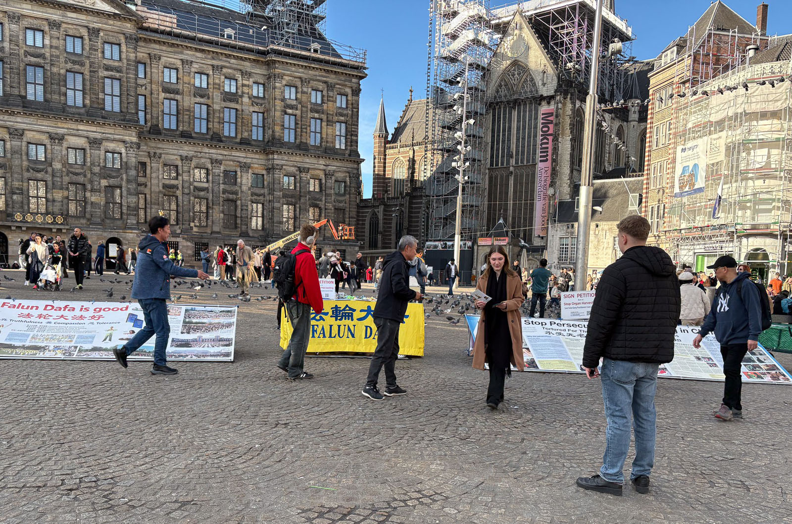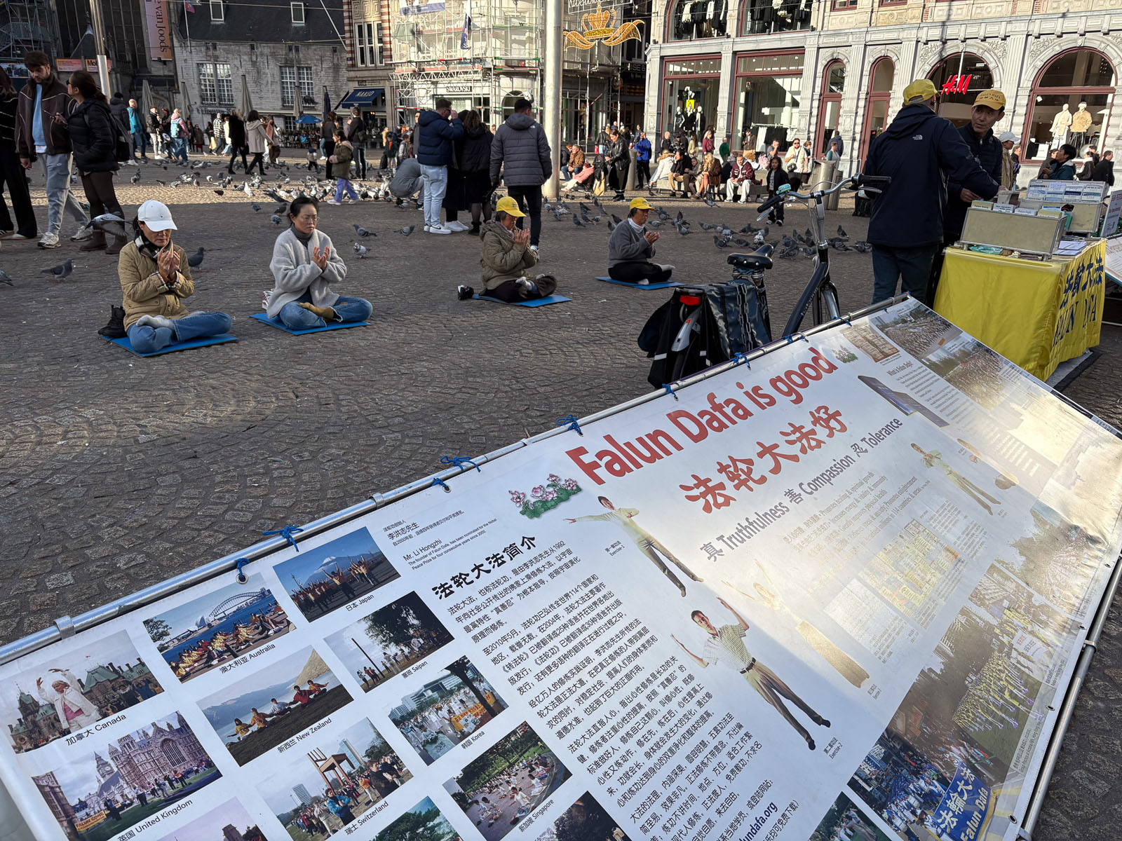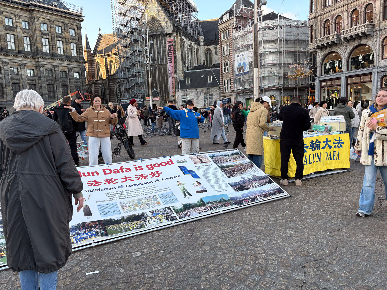 (Minghui.org) On November 9, 2025, Falun Dafa practitioners held an activity on Dam Square in Amsterdam. This square has historically been a place for people with different backgrounds to come together and share their story with the public—a fitting setting for the practitioners’ event to raise awareness about the Chinese Communist Party’s (CCP) persecution in China.
