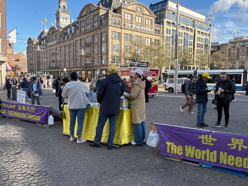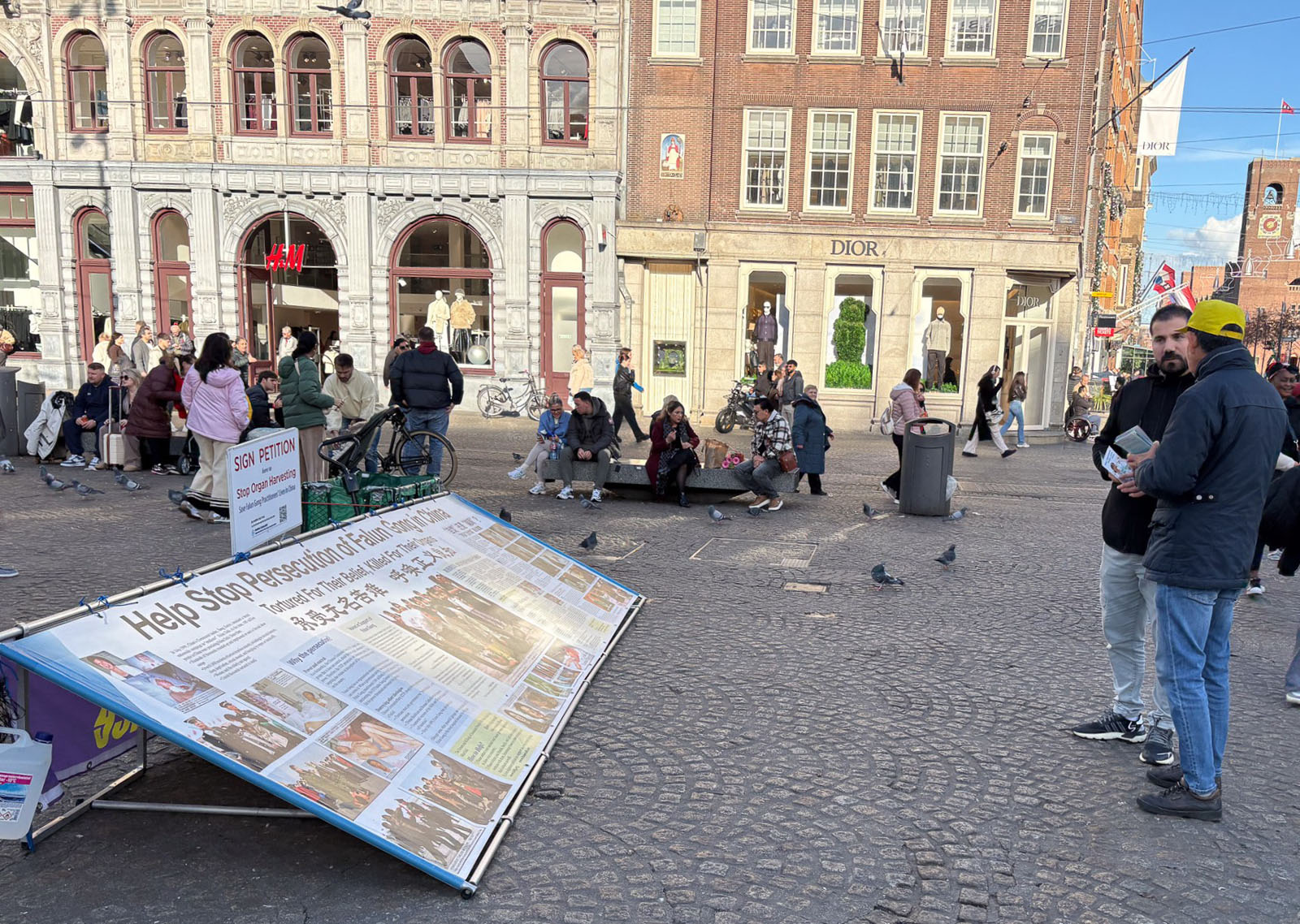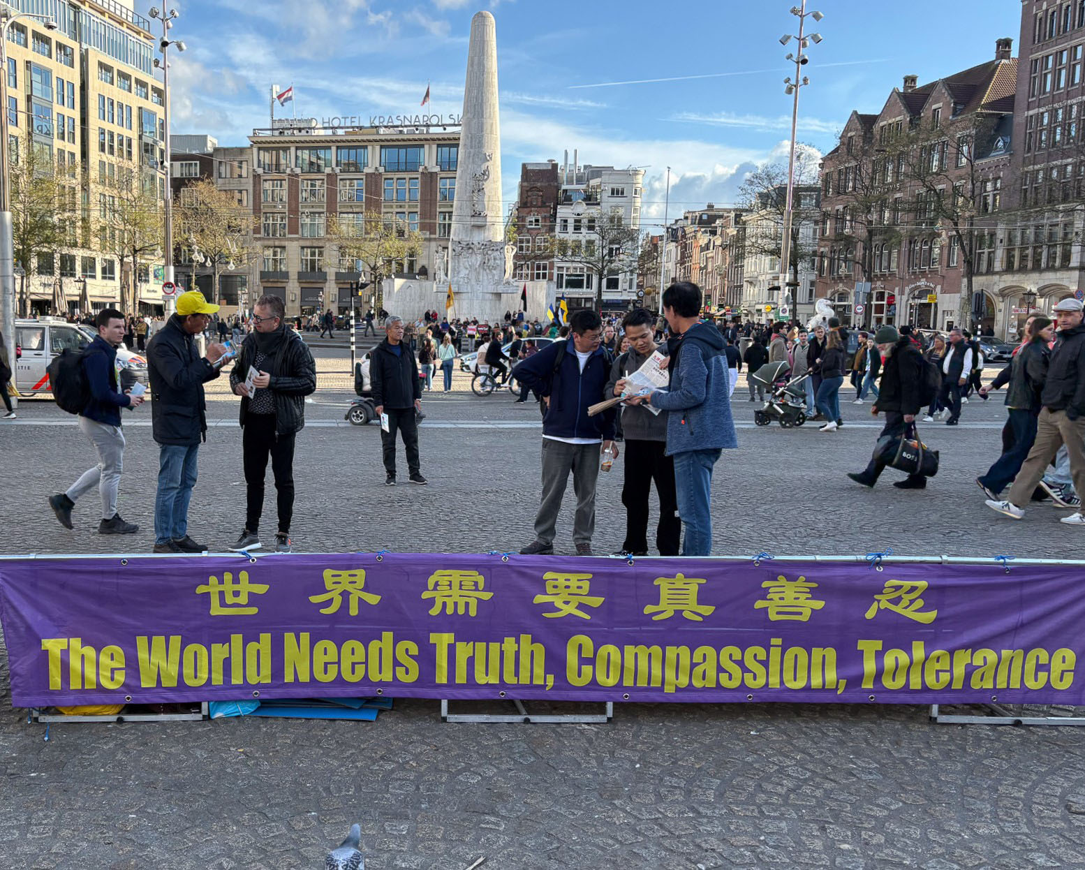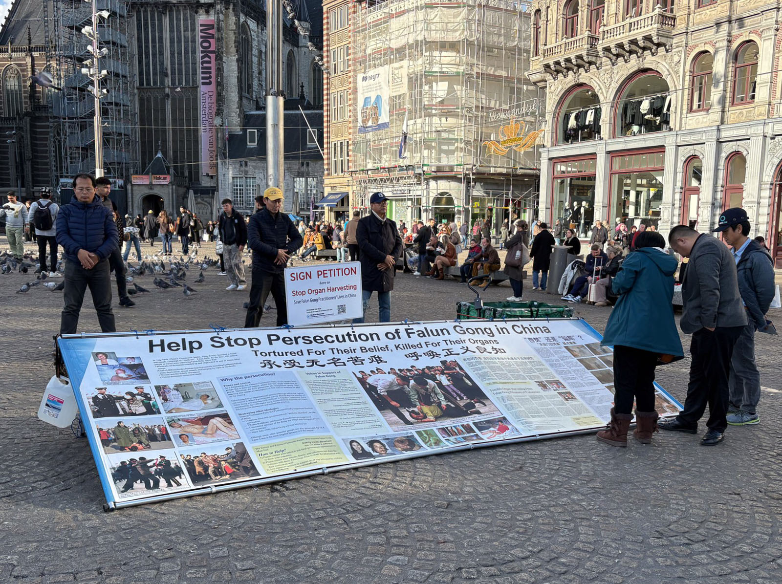 (Minghui.org) On November 9, 2025, Falun Dafa practitioners held an activity on Dam Square in Amsterdam. This square has historically been a place for people with different backgrounds to come together and share their story with the public—a fitting setting for the practitioners’ event to raise awareness about the Chinese Communist Party’s (CCP) persecution in China.