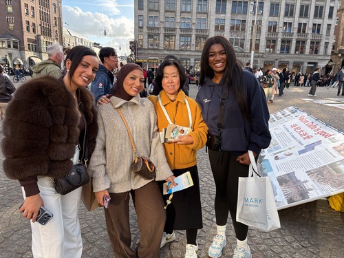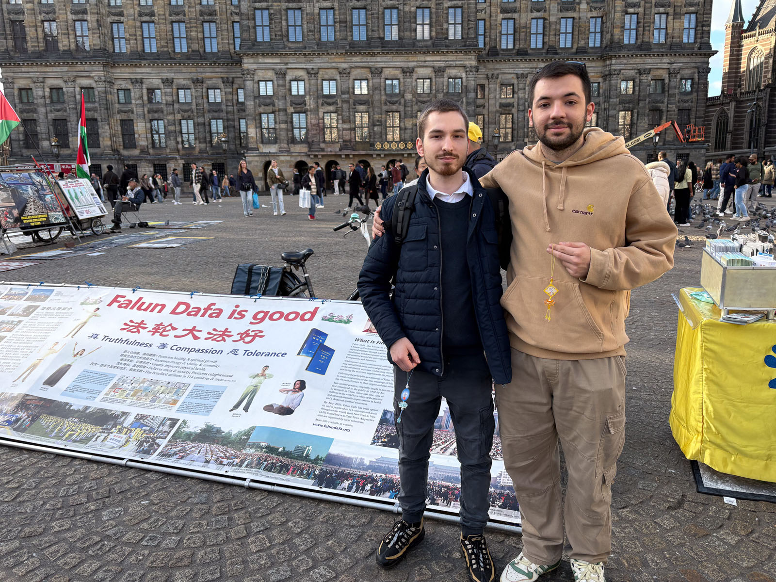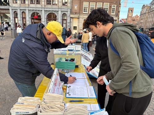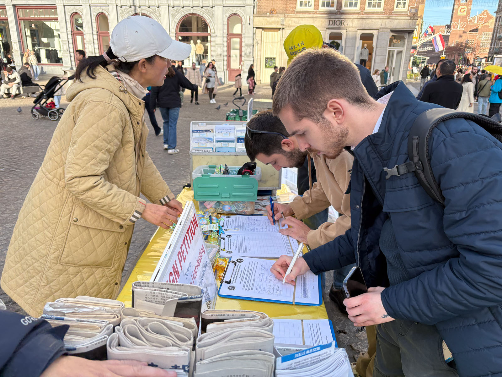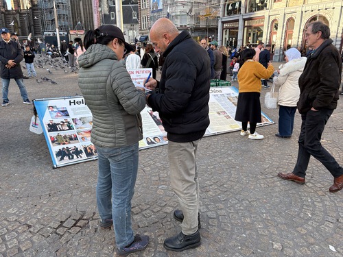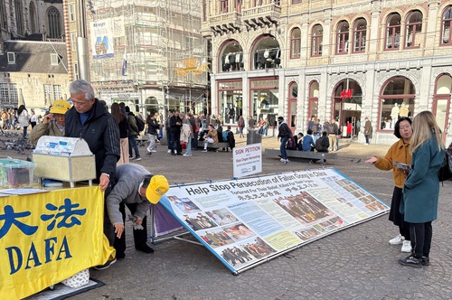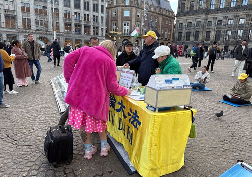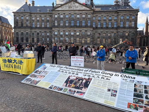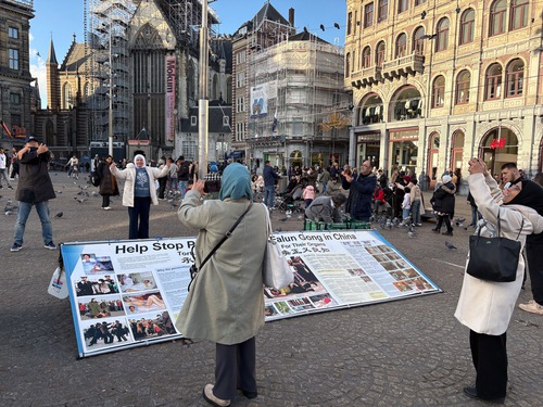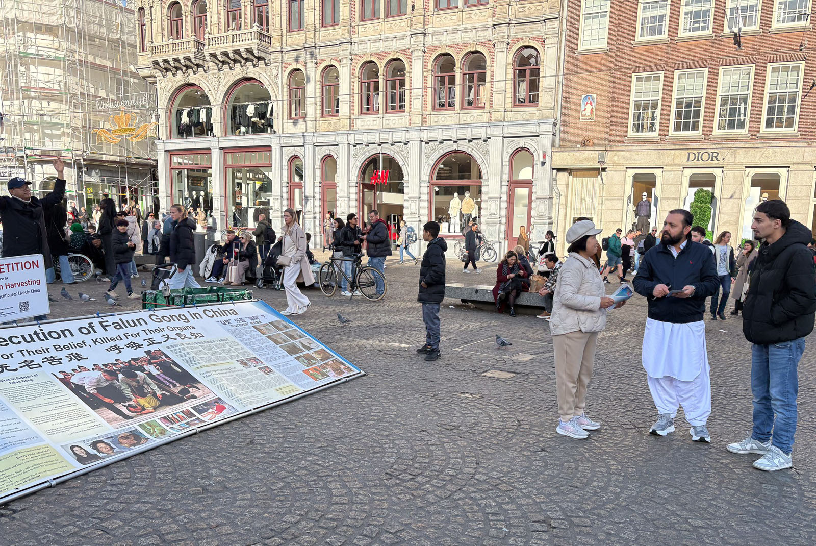 (Minghui.org) On November 9, 2025, Falun Dafa practitioners held an activity on Dam Square in Amsterdam. This square has historically been a place for people with different backgrounds to come together and share their story with the public—a fitting setting for the practitioners’ event to raise awareness about the Chinese Communist Party’s (CCP) persecution in China.