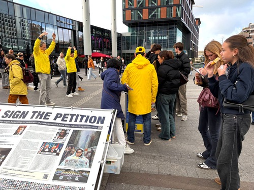 On October 26, 2025, Falun Dafa practitioners held an activity near the Utrecht Central Station to introduce Falun Dafa and raise awareness of the forced organ harvesting in China.