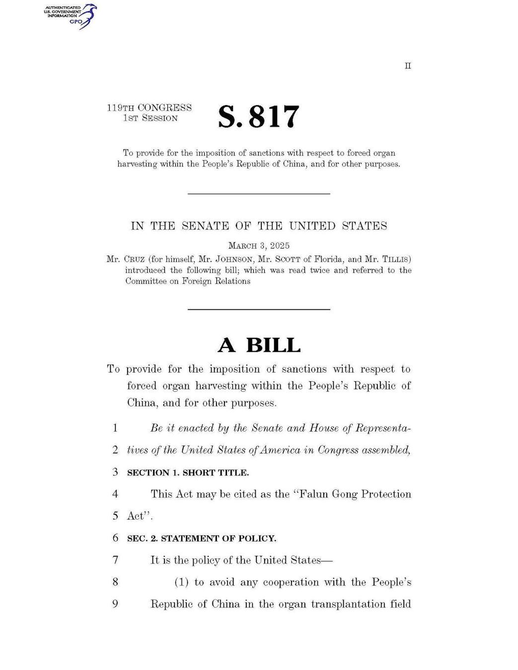 The Falun Gong Protection Act (S.817) sponsored by Senator Ted Cruz. For details, please click: https://www.congress.gov/119/bills/s817/BILLS-119s817is.xml