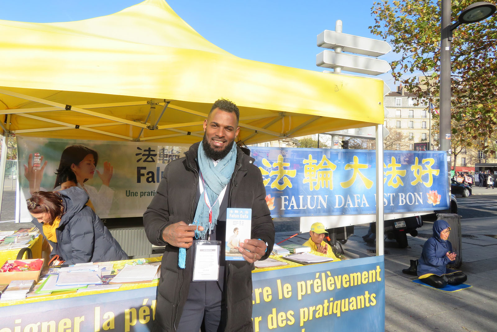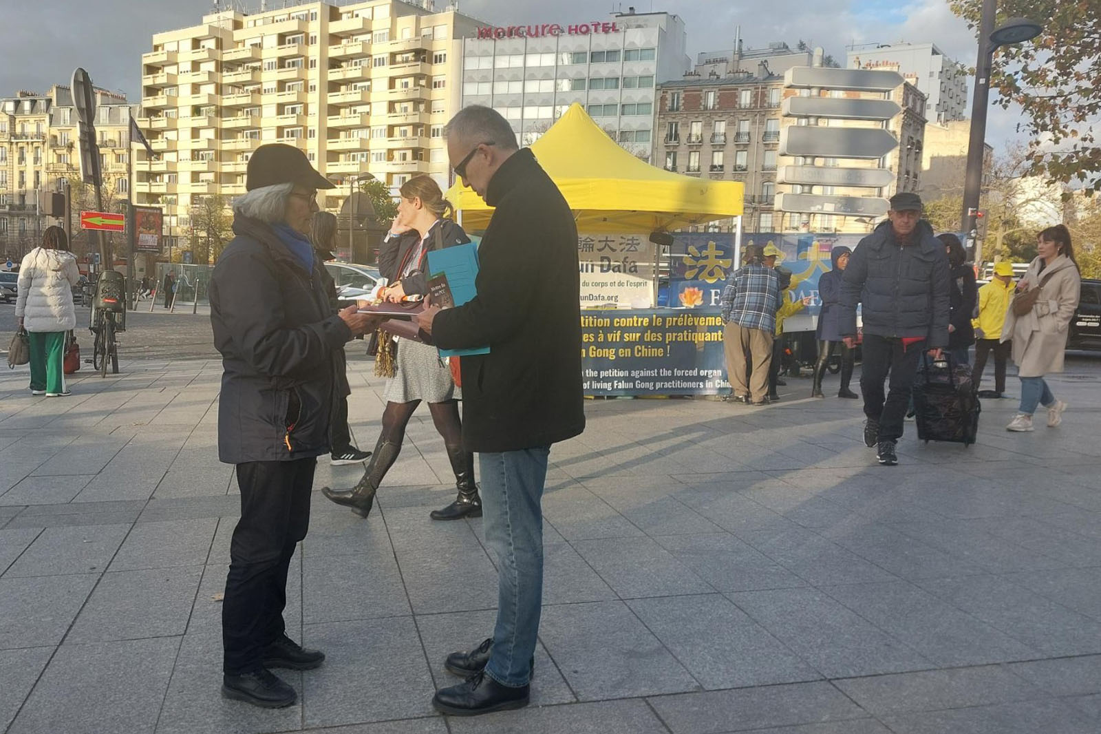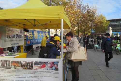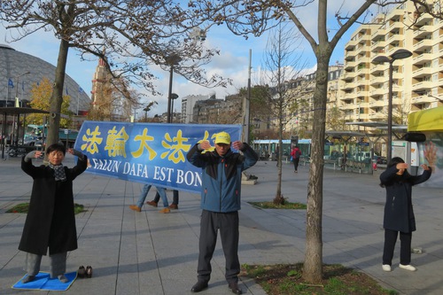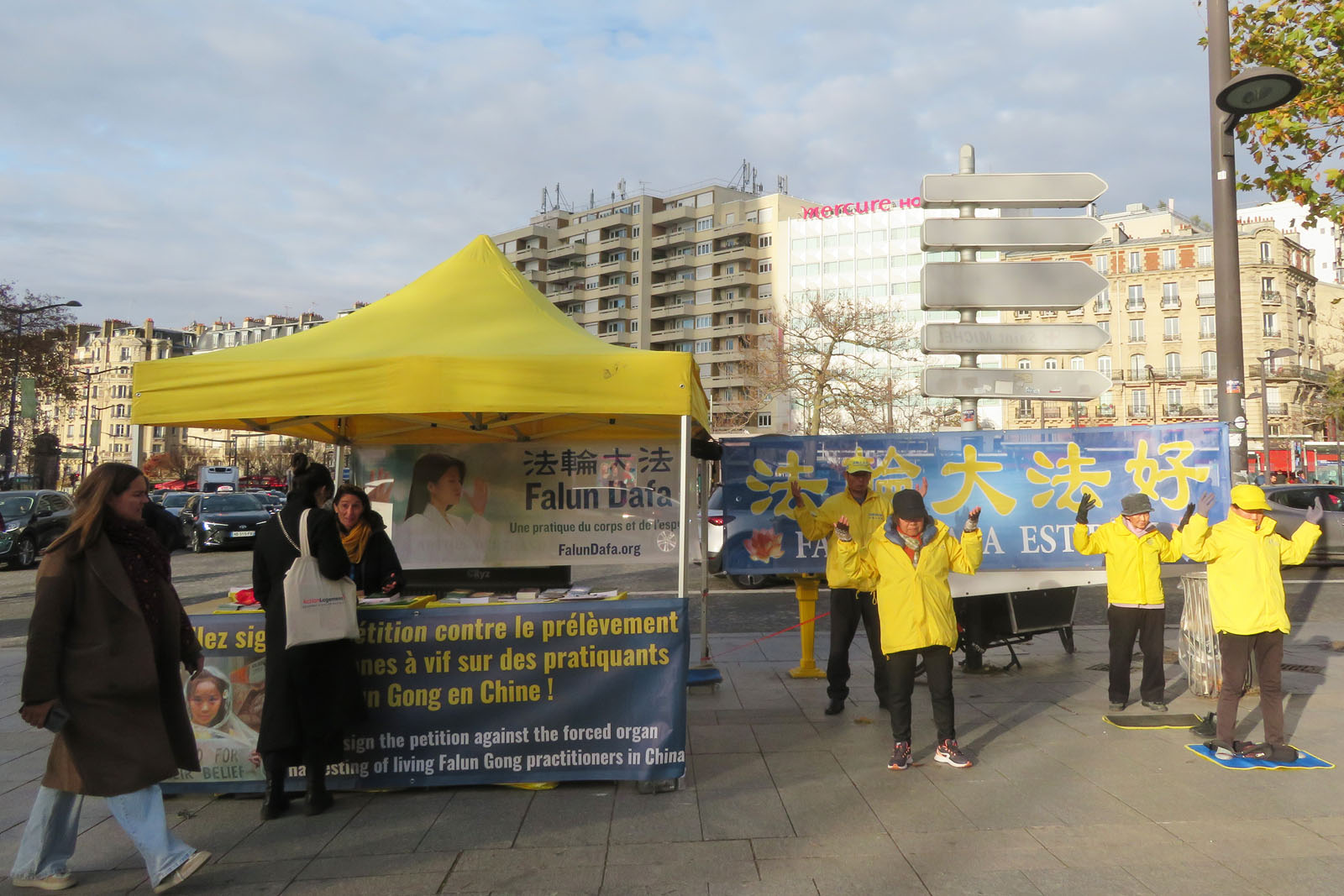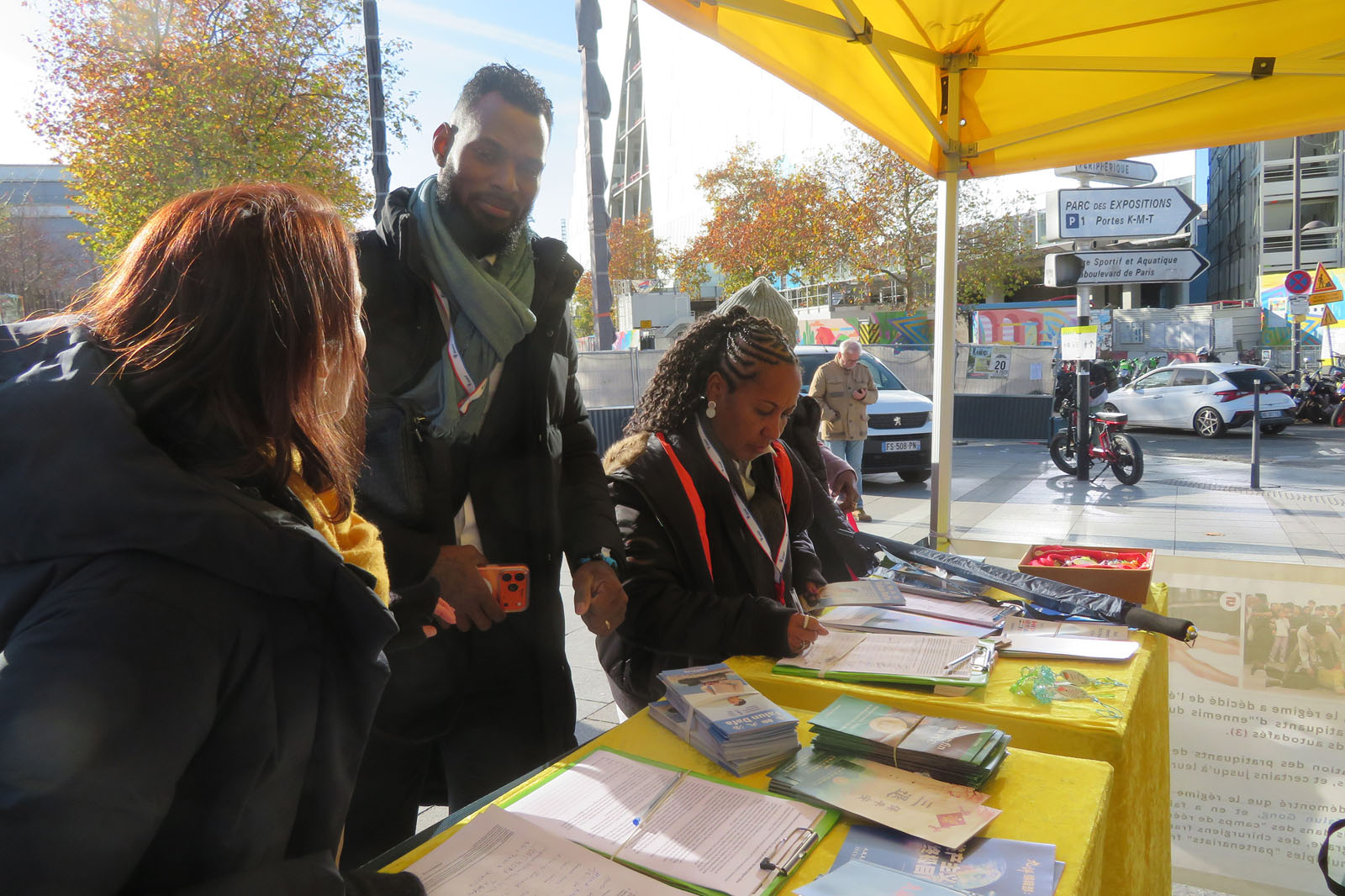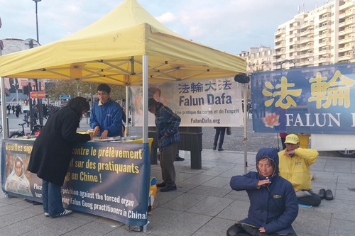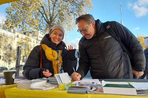 (Minghui.org) The annual Mayors and Local Authorities Fair was held at Paris Expo Porte de Versailles from November 18-20, 2025. Falun Dafa (also known as Falun Gong) practitioners took the opportunity to raise awareness of the Chinese Communist Party’s (CCP) persecution. They demonstrated the exercises and collected signatures on a petition on November 18 and 19 in front of the exhibition hall, and called to end the CCP’s persecution.