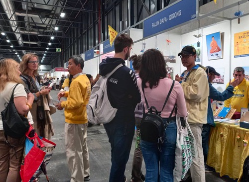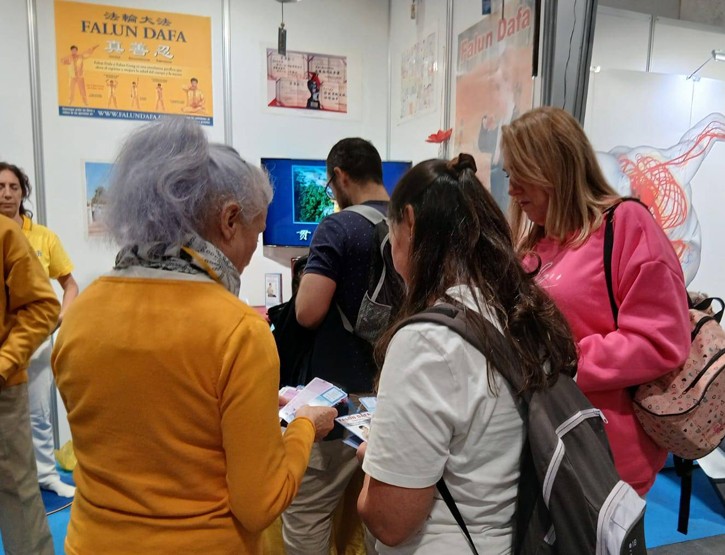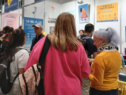 Practitioners’ booth featured a photograph of Falun Dafa’s founder Mr. Li Hongzhi, exercise-teaching videos, and posters that showed Falun Dafa being practiced worldwide. Practitioners also demonstrated the five Falun Dafa exercises with the music, which many visitors stopped to watch. Many people who wanted to learn more took materials, and some purchased Falun Dafa books. Several learned the exercises onsite.