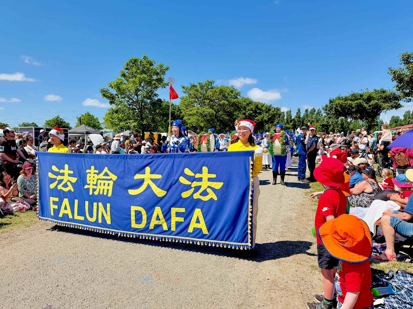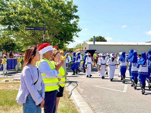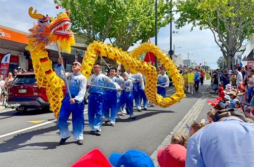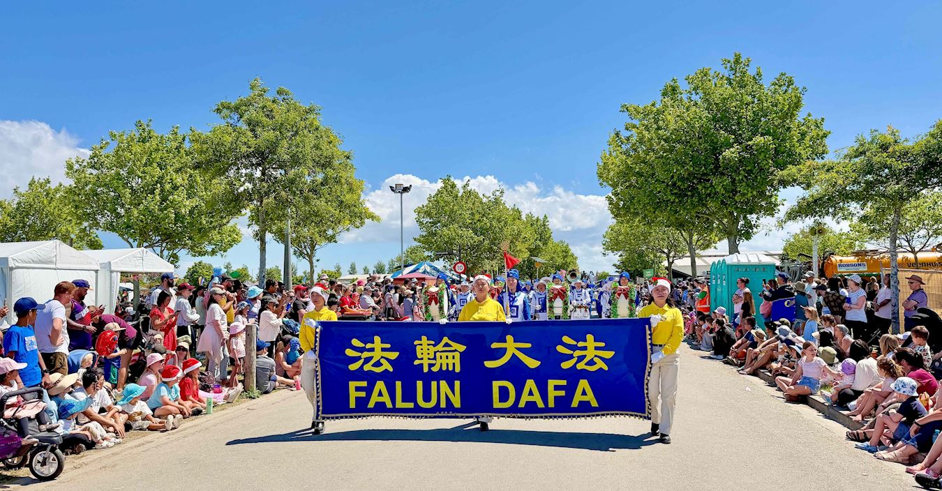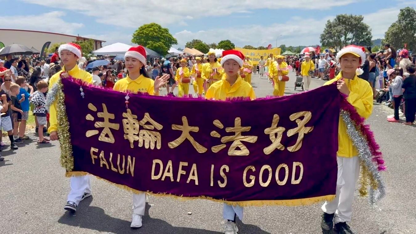(Minghui.org) Many cities in New Zealand hold Christmas parades at the end of November. This year, Falun Dafa practitioners received invitations from more than 20 cities and districts to join their annual Christmas parades. Their Tian Guo Marching Band, dragon dance, and waist drum teams participated in the parades in Christchurch, Onehunga of Auckland, and Papakura of Auckland, on November 22 and 23, 2025.